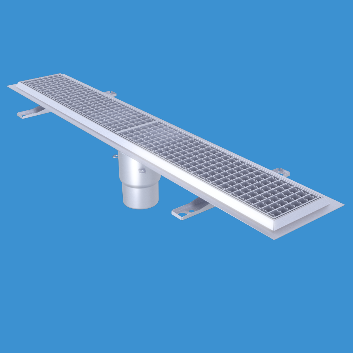 FURO 115 för bl.a. storkök och industri med lättare belastningar. Av syrafast rostfritt stål med bottenutlopp Ø110 mm, fyrkantöverdel med galler L15 dim. 1200x150 mm. För massagolv. Komplettera ev. med silkorg 7119548.
