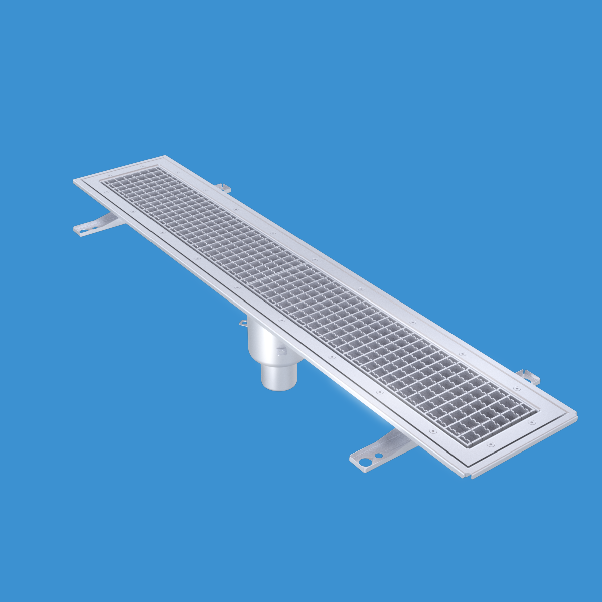 FURO 115 för bl.a. storkök och industri med lättare belastningar. Av syrafast rostfritt stål med bottenutlopp Ø75 mm, fyrkantöverdel med galler L15 dim. 1200x150 mm. För golv med plastmatta. Komplettera ev. med silkorg 7119548.