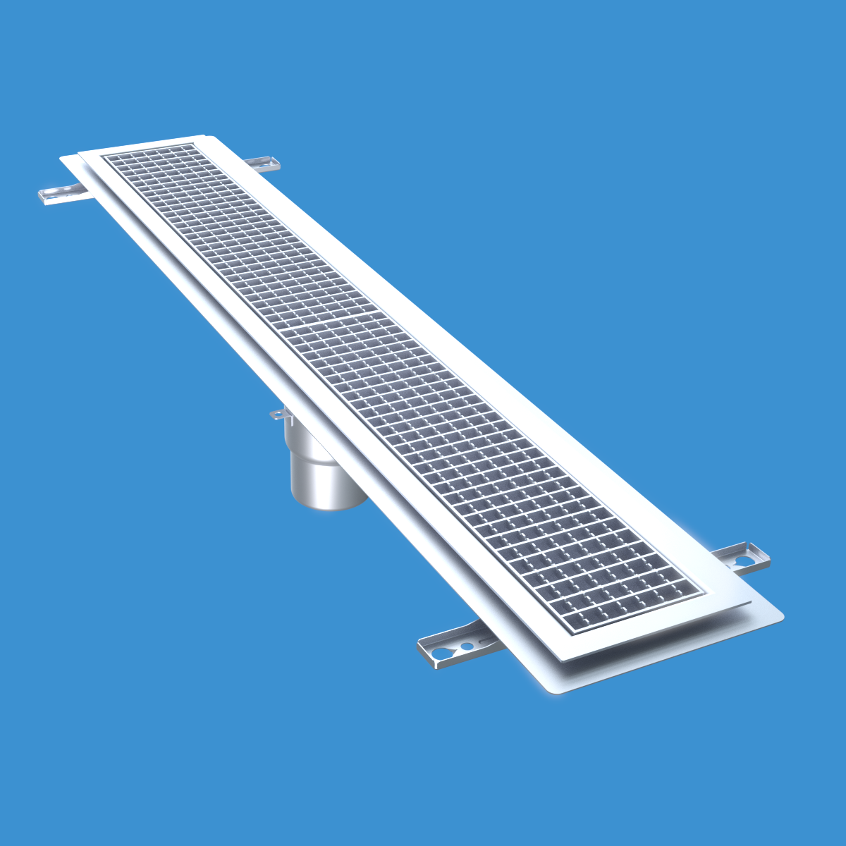 FURO 115 för bl.a. storkök och industri med lättare belastningar. Av syrafast rostfritt stål med bottenutlopp Ø110 mm, fyrkantöverdel med galler L15 dim. 1400x150 mm. För Klinkergolv K4, tätskikt som klistras mot klisterfläns. Komplettera ev. med silkorg 7119548.