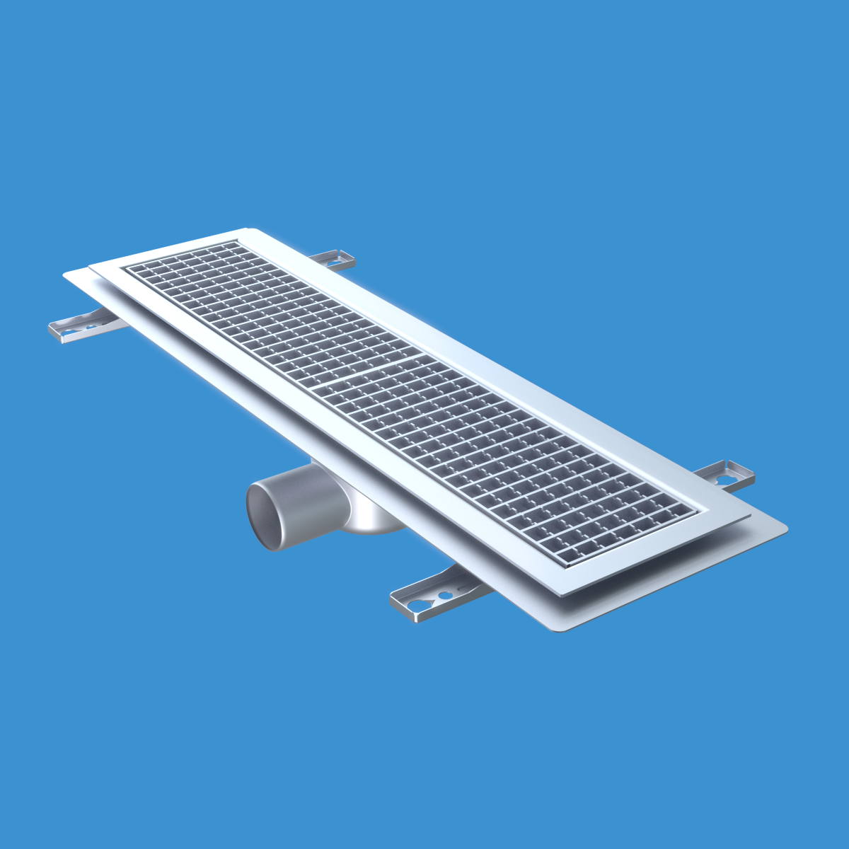 FURO 115 för bl.a. storkök och industri med lättare belastningar. Av syrafast rostfritt stål med sidoutlopp Ø75 mm, fyrkantöverdel med galler L15 dim. 800x150 mm. För Klinkergolv K4, tätskikt som klistras mot klisterfläns. Komplettera ev. med silkorg 7119548.