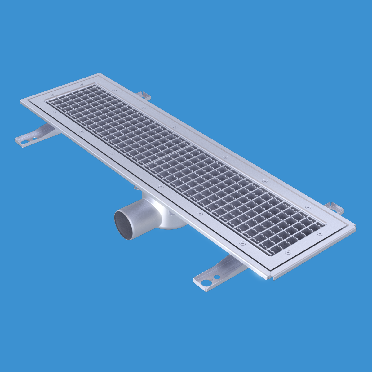 FURO 115 för bl.a. storkök och industri med lättare belastningar. Av syrafast rostfritt stål med sidoutlopp Ø75 mm, fyrkantöverdel med galler L15 dim. 800x150 mm. För golv med plastmatta. Komplettera ev. med silkorg 7119548.