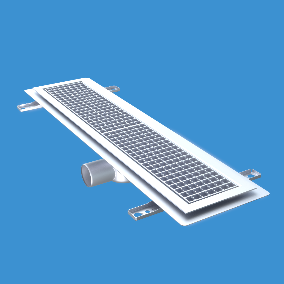 FURO 115 för bl.a. storkök och industri med lättare belastningar. Av syrafast rostfritt stål med sidoutlopp Ø75 mm, fyrkantöverdel med galler L15 dim. 900x150 mm. För Klinkergolv K4, tätskikt som klistras mot klisterfläns. Komplettera ev. med silkorg 7119548.