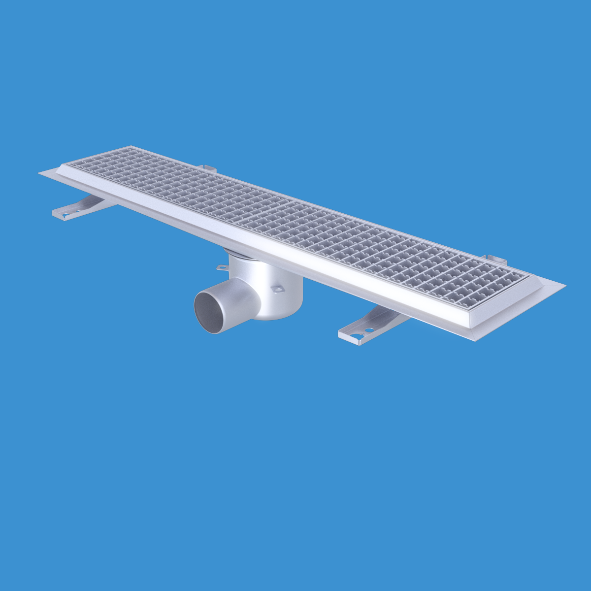 FURO 115 för bl.a. storkök och industri med lättare belastningar. Av syrafast rostfritt stål med sidoutlopp Ø75 mm, fyrkantöverdel med galler L15 dim. 900x150 mm. För massagolv. Komplettera ev. med silkorg 7119548.