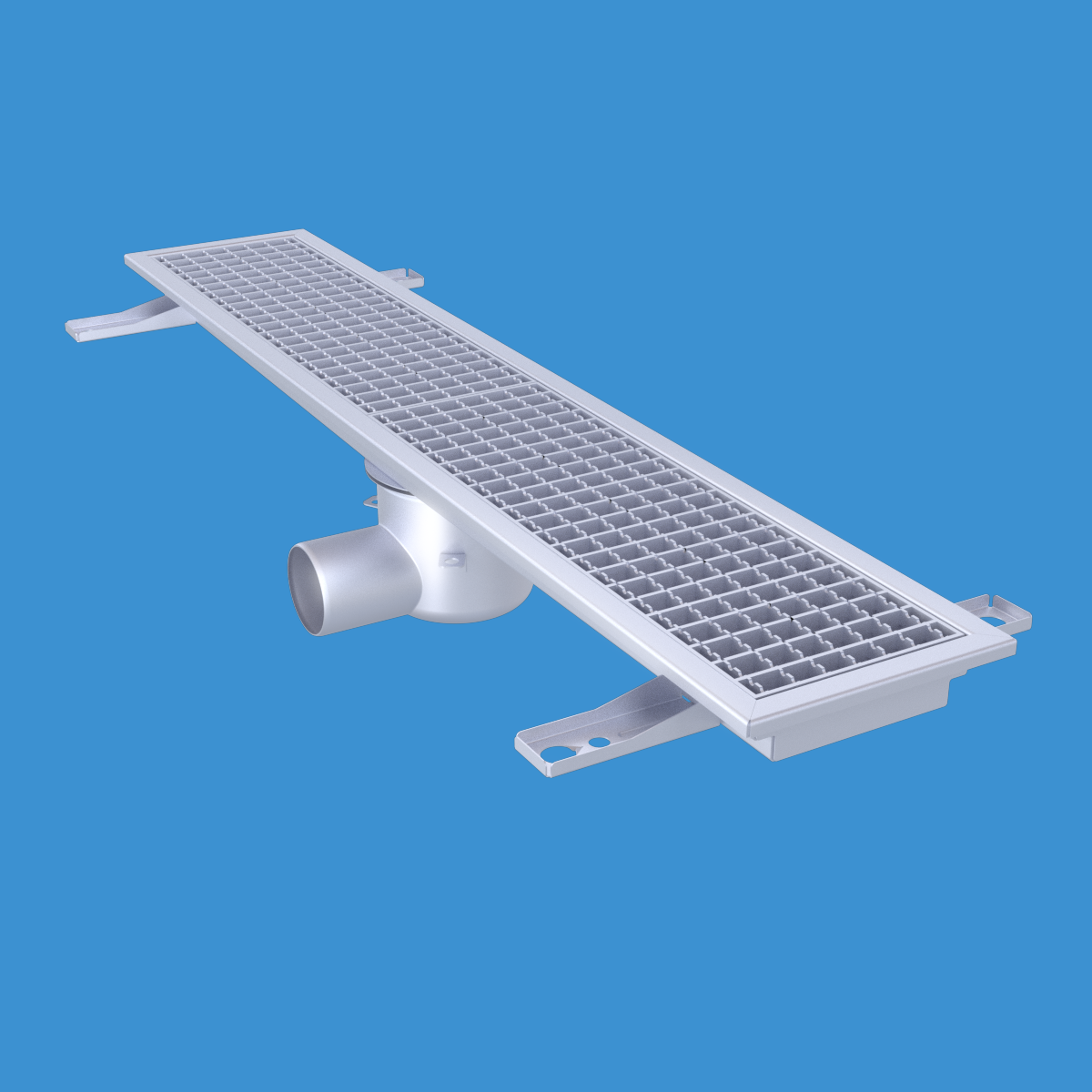 FURO 115 för bl.a. storkök och industri med lättare belastningar. Av syrafast rostfritt stål med sidoutlopp Ø75 mm, fyrkantöverdel med galler L15 dim. 1000x150 mm. För Klinkergolv K3, utan tätskikt alt. Stålslipat betonggolv. Komplettera ev. med silkorg 7119548.