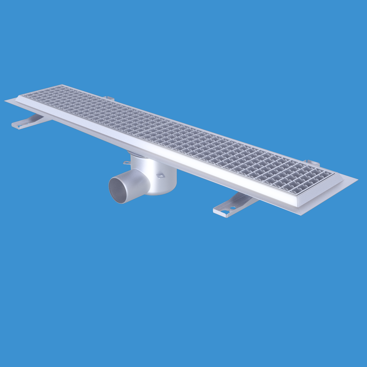 FURO 115 för bl.a. storkök och industri med lättare belastningar. Av syrafast rostfritt stål med sidoutlopp Ø75 mm, fyrkantöverdel med galler L15 dim. 1000x150 mm. För massagolv. Komplettera ev. med silkorg 7119548.