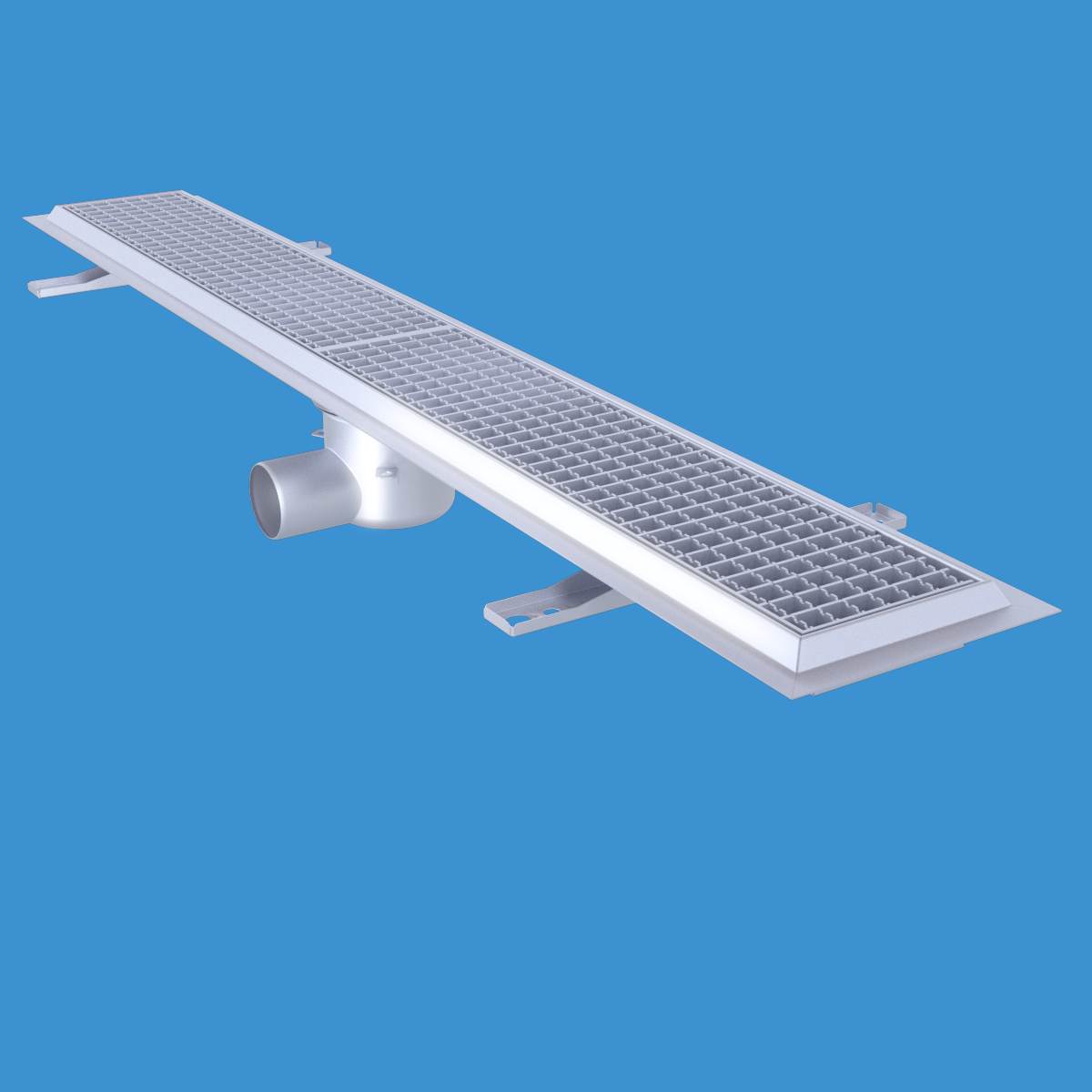 FURO 115 för bl.a. storkök och industri med lättare belastningar. Av syrafast rostfritt stål med sidoutlopp Ø75 mm, fyrkantöverdel med galler L15 dim. 1400x150 mm. För massagolv. Komplettera ev. med silkorg 7119548.