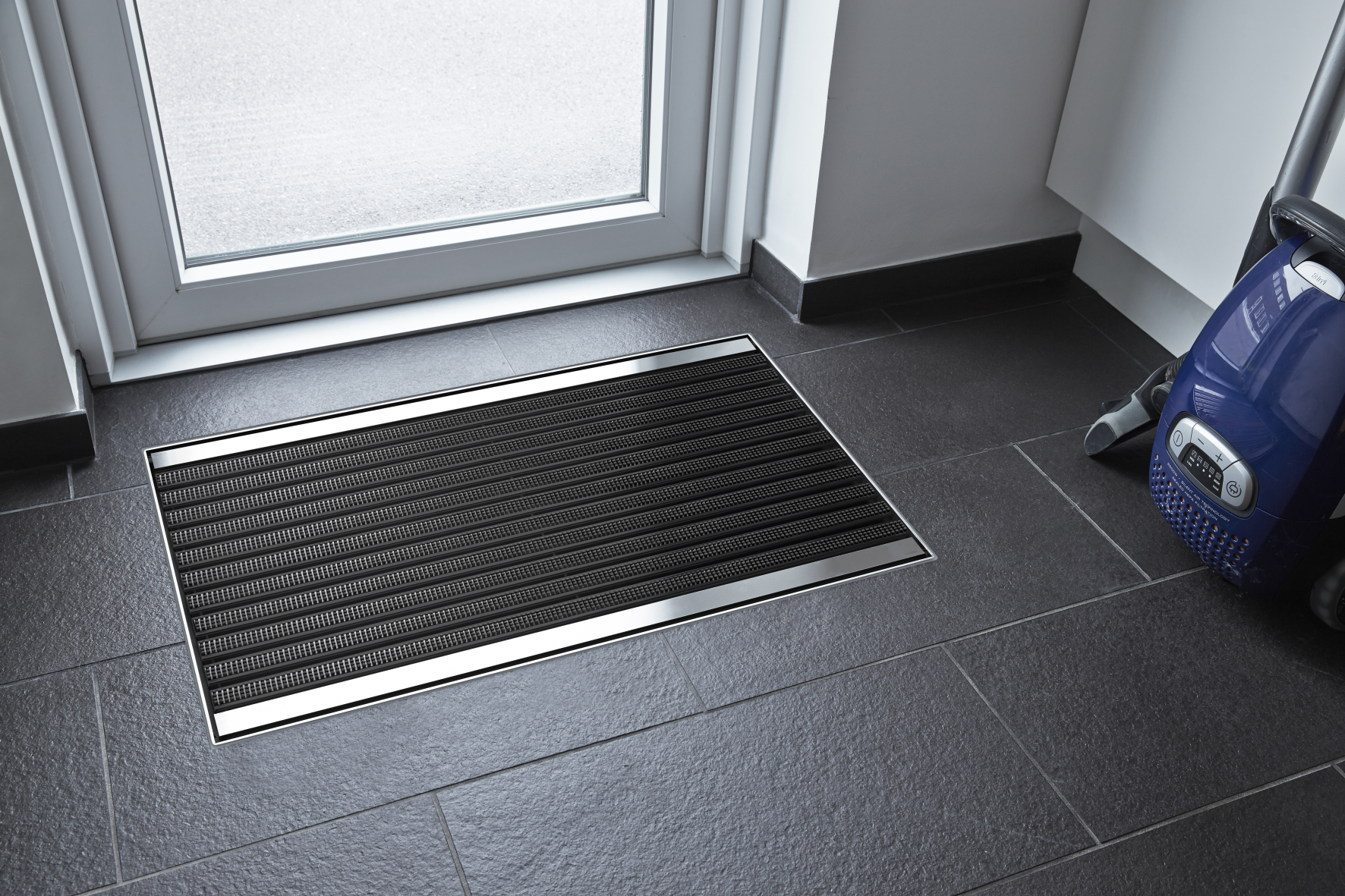 MatLine placeras i entren eller i grovköksentren och kan anslutas till avloppsystemet så att överskottsvatten kan ledas bort. Golvbrunnen är försedd med urtagbart sandfång för enkel rengöring. Kraftiga och slitstarka nylonborstar för säker rengöring av skor och stövlar.