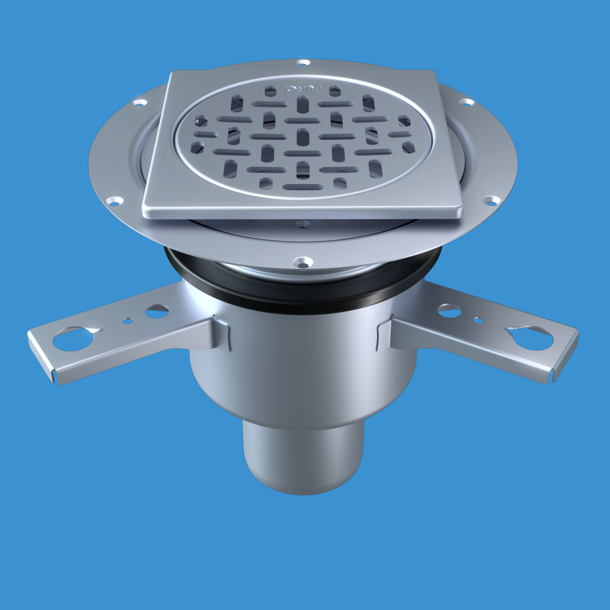 FURO 007 för alla våtutrymmen i offentliga miljöer. Av syrafast rostfritt stål. Dim. Ø132 mm. Bottenutlopp Ø75 mm. Sil i belastningsklass K3. För klinkergolv K5, tätskikt som kläms fast.