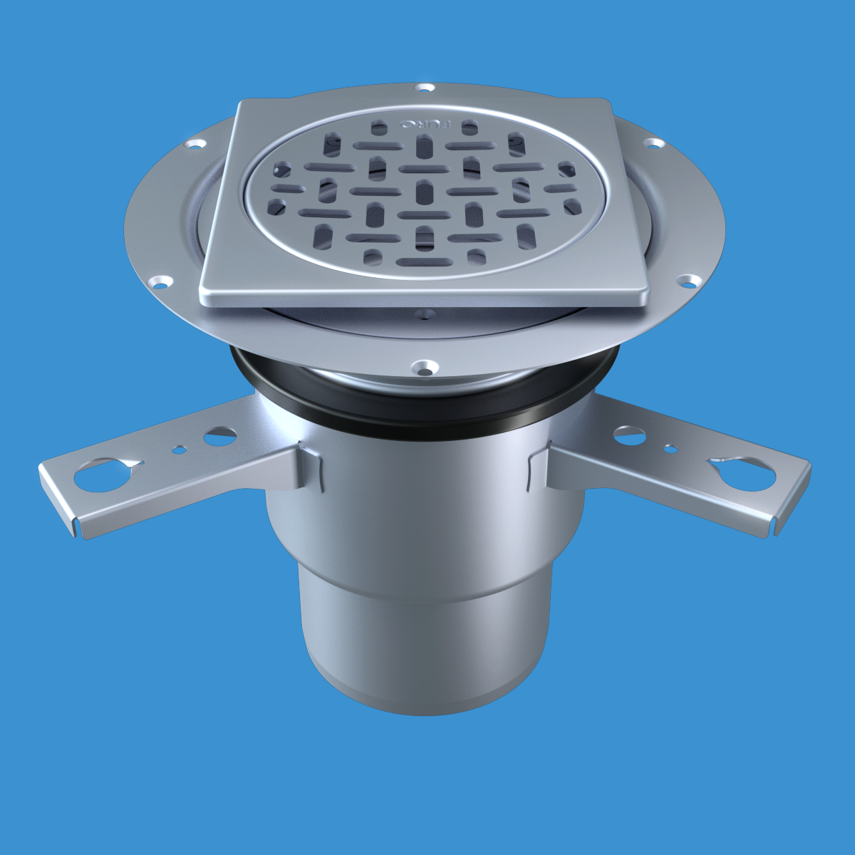 FURO 007 för alla våtutrymmen i offentliga miljöer. Av syrafast rostfritt stål. Dim. Ø132 mm. Bottenutlopp Ø110 mm. Sil i belastningsklass K3. För klinkergolv K5, tätskikt som kläms fast.