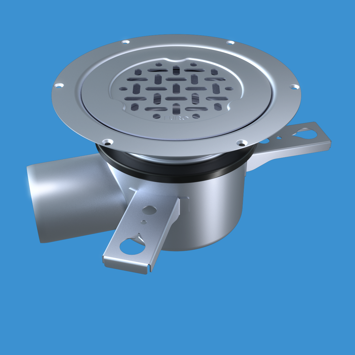 FURO 007 för alla våtutrymmen i offentliga miljöer. Av syrafast rostfritt stål. Dim. Ø132 mm. Sidoutlopp Ø75 mm. Sil i belastningsklass K3. För golv med plastmatta.
