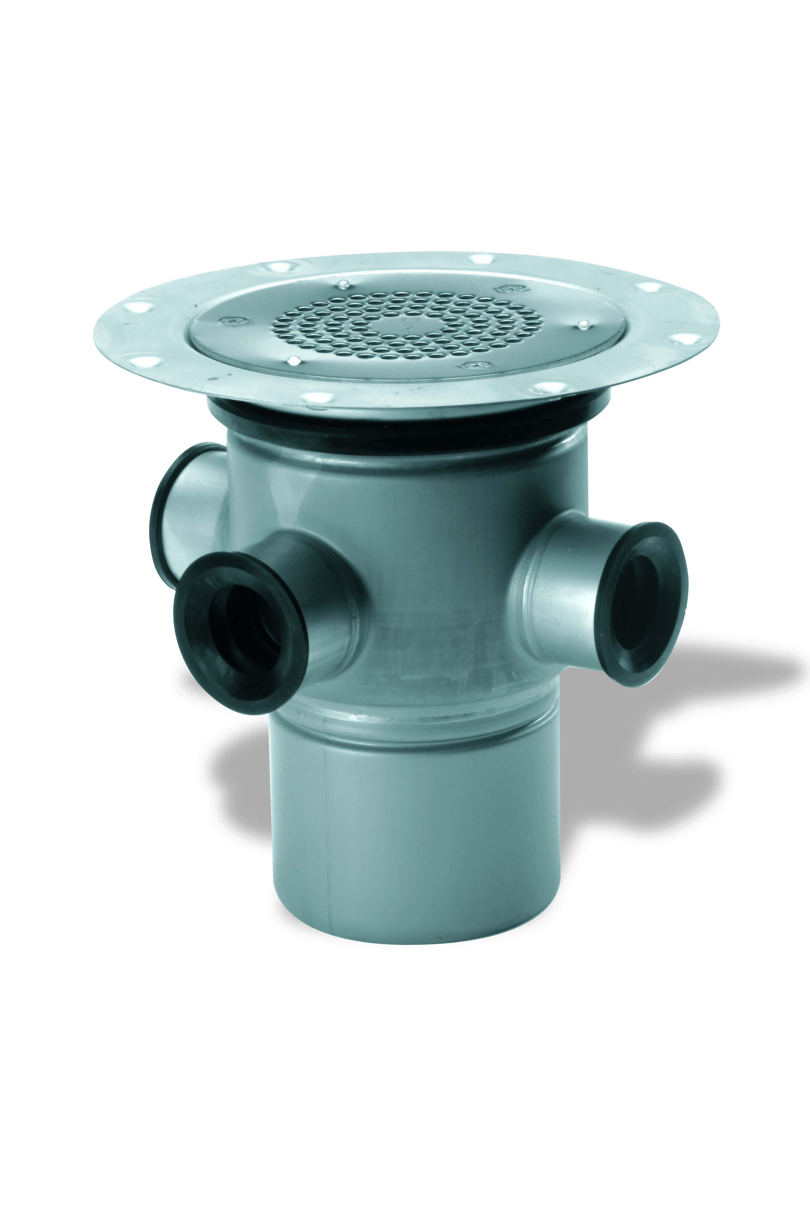 ACO STAINLESS EG150V/75FT-3i, golvbrunn i rostfritt stål AISI 304, bottenutlopp dim 75, teleskopisk, klämring för golv med plastmatta, 3 inlopp dim 32/40, VA godkänd SITAC 0073/00
