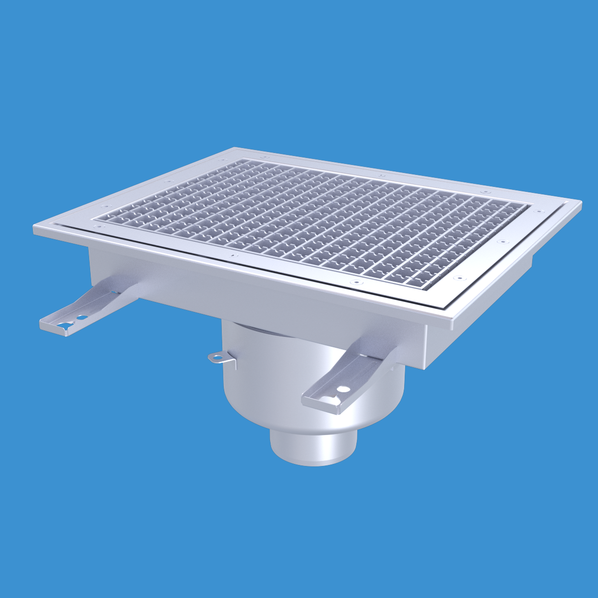 FURO 113 för bl.a. storkök och industri med lättare belastningar. Av syrafast rostfritt stål med bottenutlopp Ø110 mm, fyrkantöverdel med galler L15 dim. 400x300 mm. För golv med plastmatta. Komplettera ev. med silkorg 7120796.