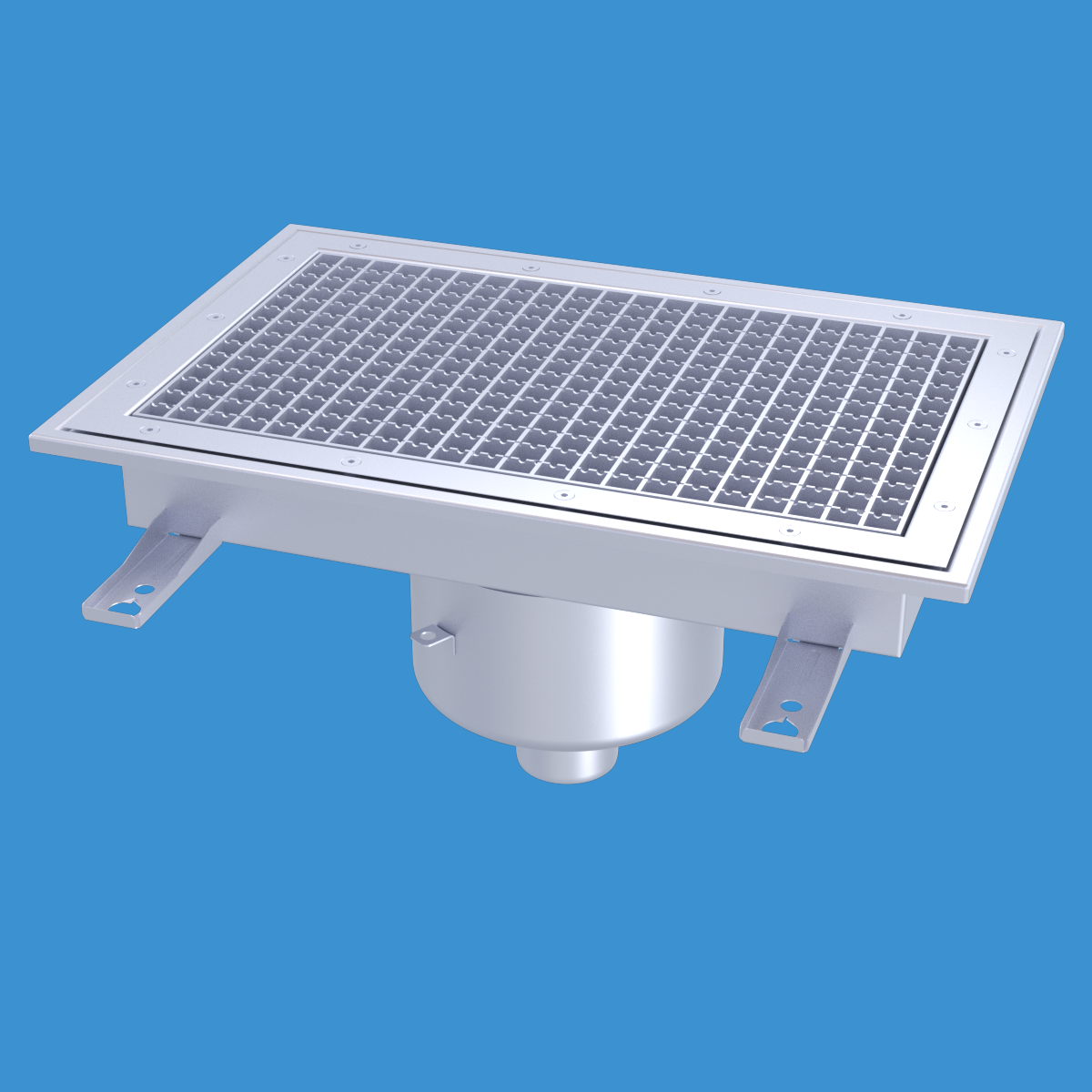 FURO 113 för bl.a. storkök och industri med lättare belastningar. Av syrafast rostfritt stål med bottenutlopp Ø75 mm, fyrkantöverdel med galler L15 dim. 500x300 mm. För golv med plastmatta. Komplettera ev. med silkorg 7120796.