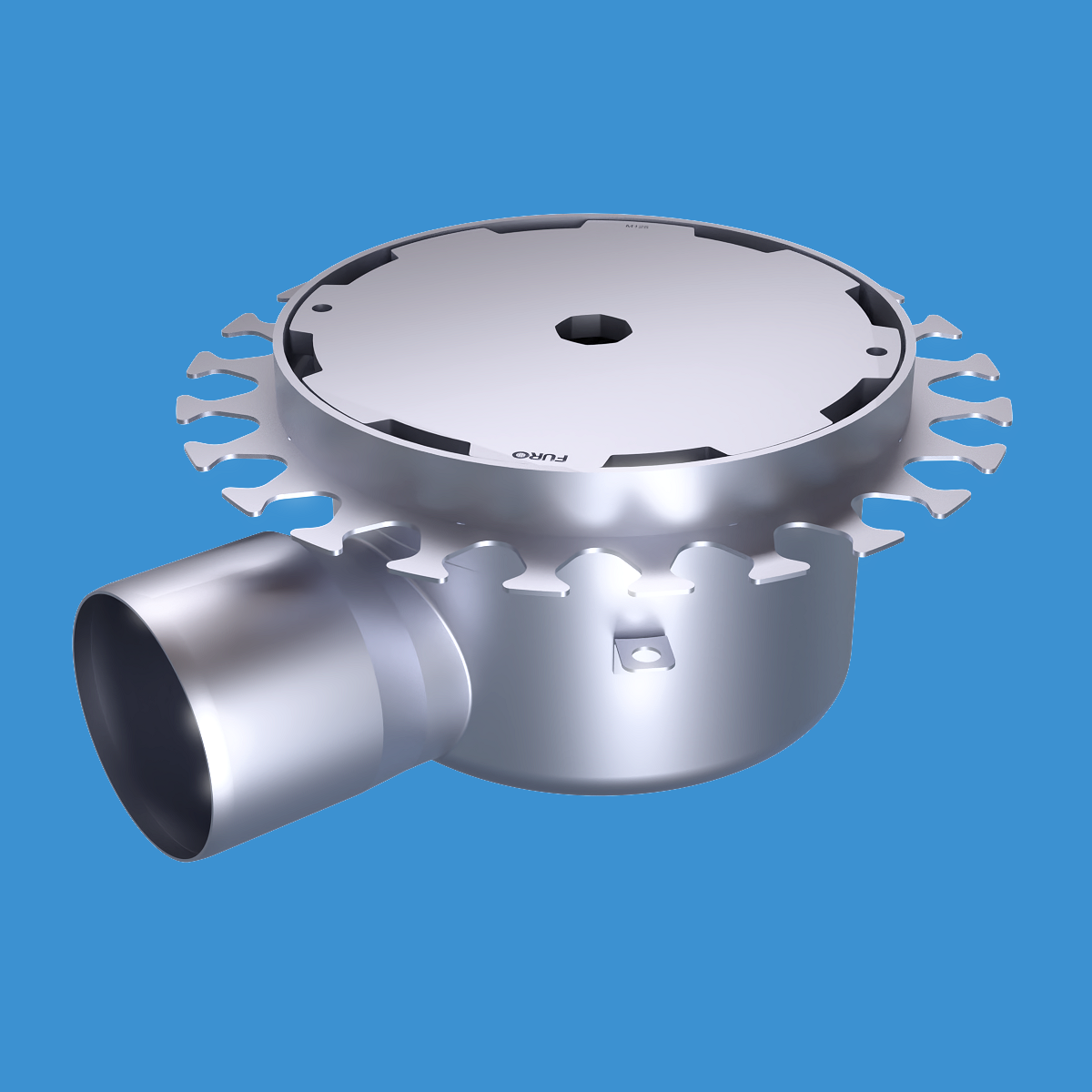 FURO 140 för bl.a. fabriker och verkstäder med tyngre belastningar. Av syrafast rostfritt stål med sidoutlopp Ø110 mm, rund överdel med spaltlock M125 dim. Ø250 mm. För Stålslipat betonggolv. Komplettera ev. med silkorg 7121560.
