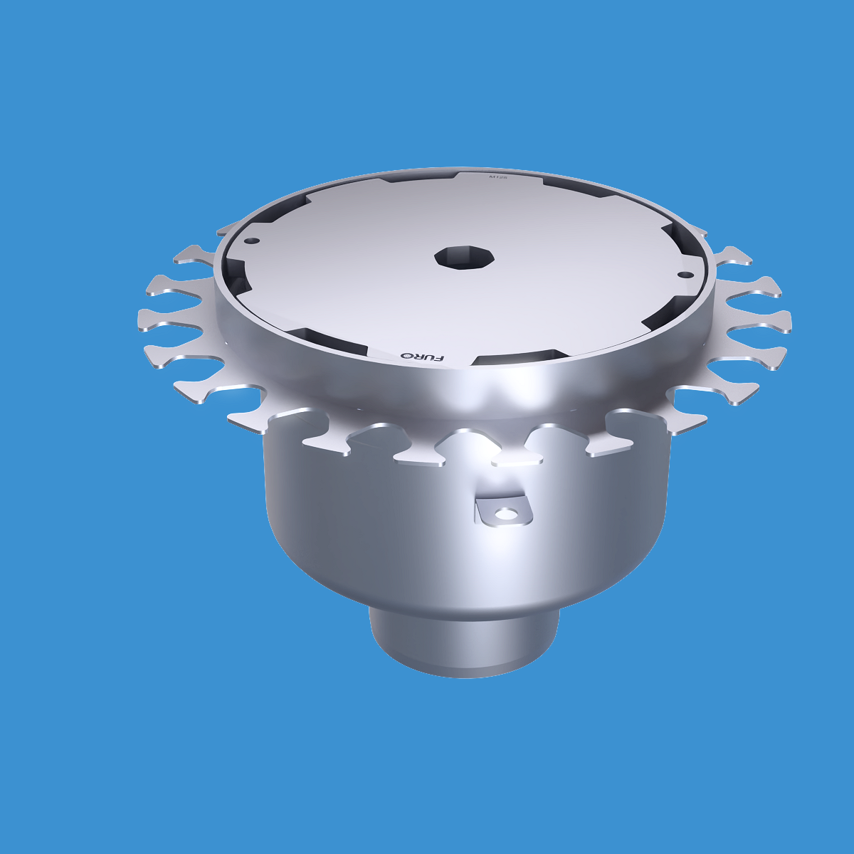 FURO 140 för bl.a. fabriker och verkstäder med tyngre belastningar. Av syrafast rostfritt stål med bottenutlopp Ø110 mm, rund överdel med spaltlock M125 dim. Ø250 mm. För Stålslipat betonggolv. Komplettera ev. med silkorg 7121560.