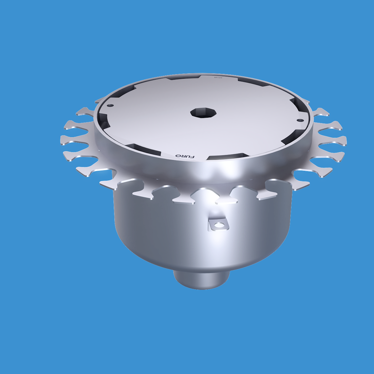 FURO 140 för bl.a. fabriker och verkstäder med tyngre belastningar. Av syrafast rostfritt stål med bottenutlopp Ø75 mm, rund överdel med spaltlock M125 dim. Ø250 mm. För Stålslipat betonggolv. Komplettera ev. med silkorg 7121560.