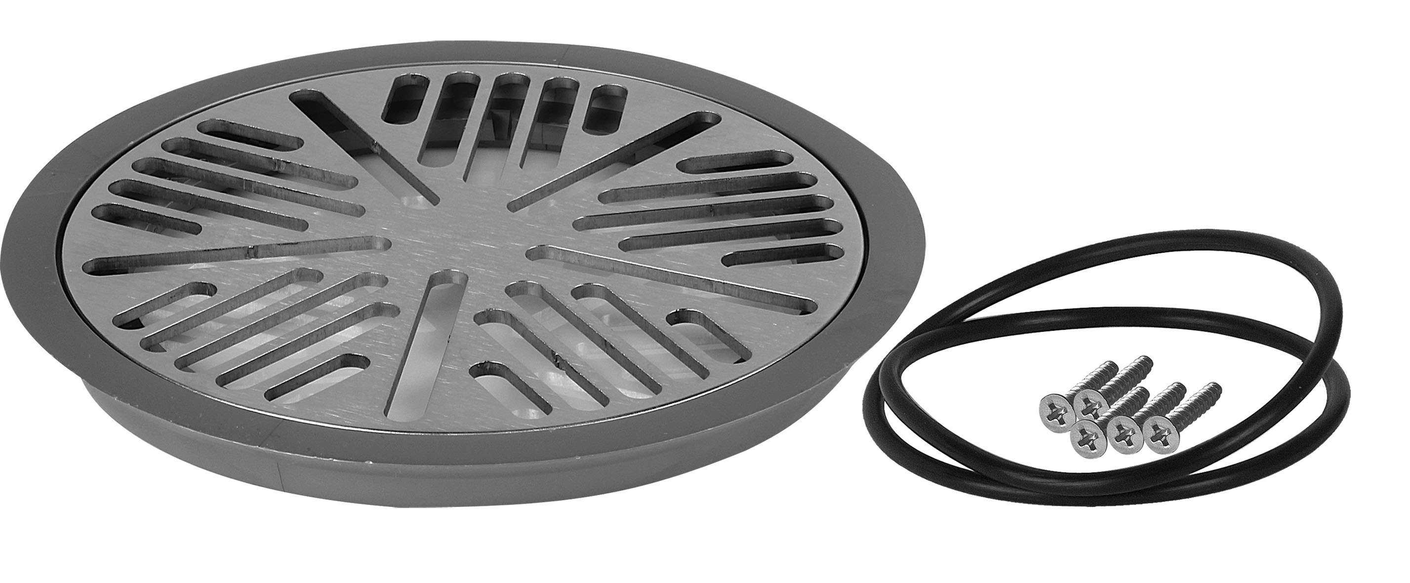 Rostfritt silpaket med grå klämring, o-ring och skruv till Faluplasts golvbrunnar, FlexiBrunn, Siv, Ida, Rut och Bodil.
