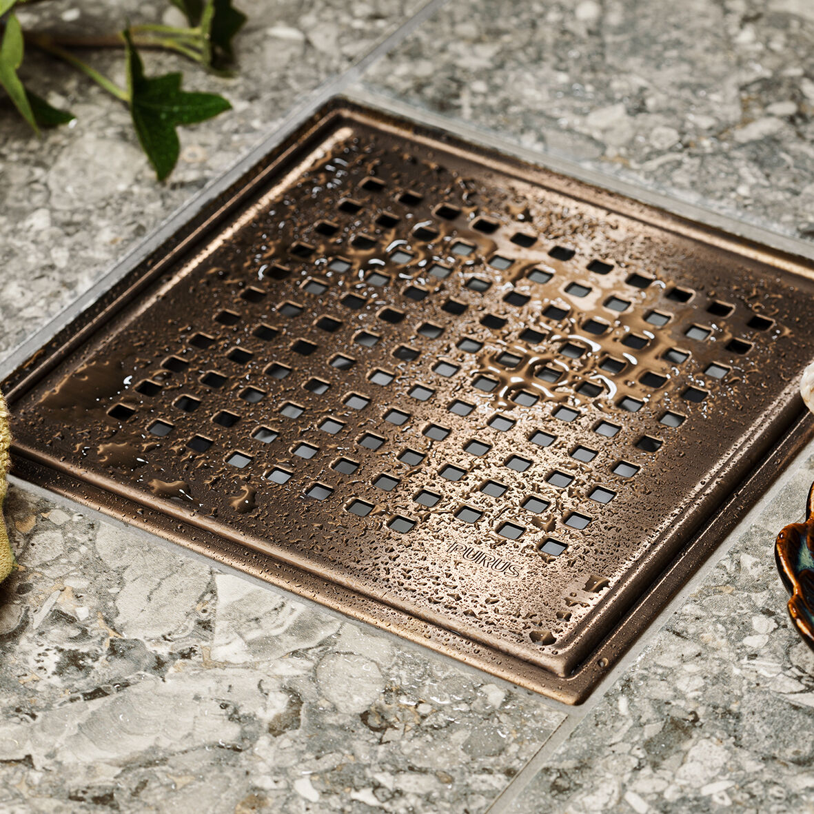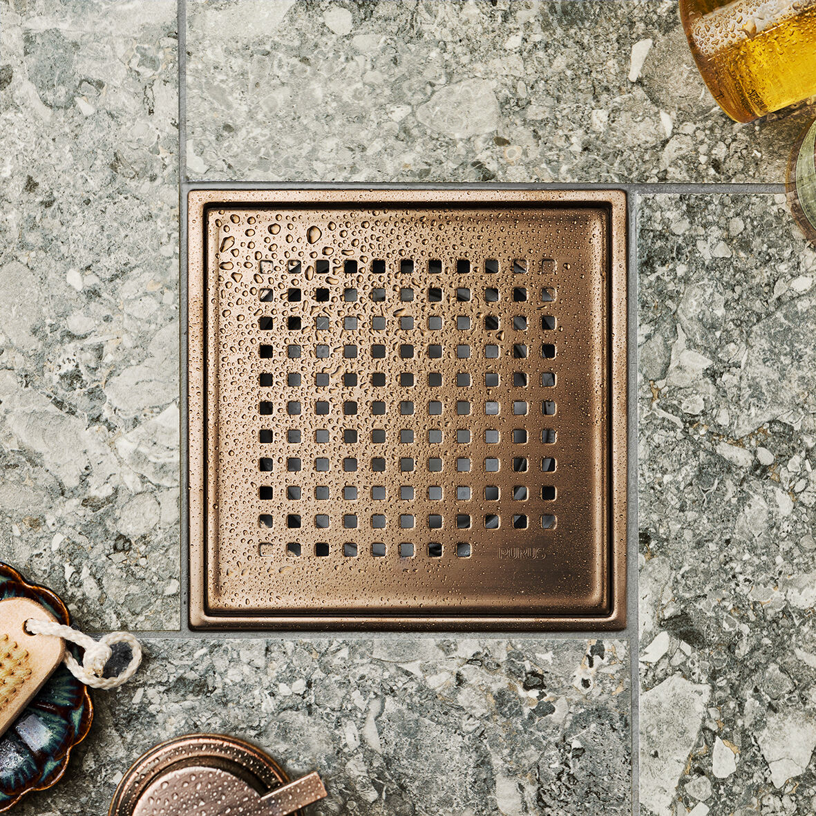 Klinkerram Chess brons är en klinkerram med fyrkantig golvbrunnssil med hög kvalitet i PVD belagt rostfritt stål. Klinkerramen ingår i designserien Purus Square.