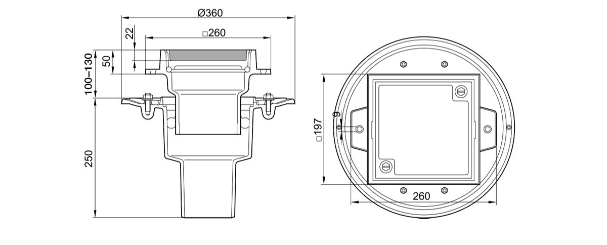 Spol- och rensbrunn för inbyggd horisontell spillvattenledning inomhus. Avsedd att gjutas in i golv, finns i olika utföranden för olika golvbeläggningar, belastningsklasser samt med eller utan klämfläns för tätskikt. Ställbarhet i höjdled varierar mellan modellerna.