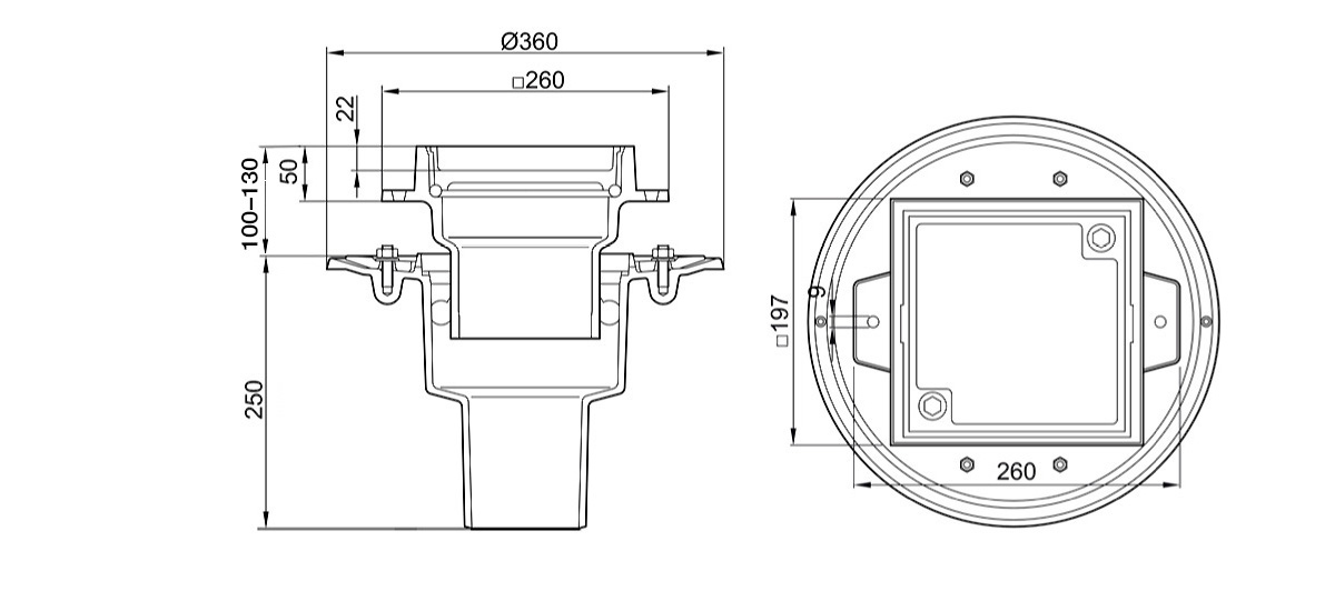 Spol- och rensbrunn för inbyggd horisontell spillvattenledning inomhus. Avsedd att gjutas in i golv, finns i olika utföranden för olika golvbeläggningar, belastningsklasser samt med eller utan klämfläns för tätskikt. Ställbarhet i höjdled varierar mellan modellerna.