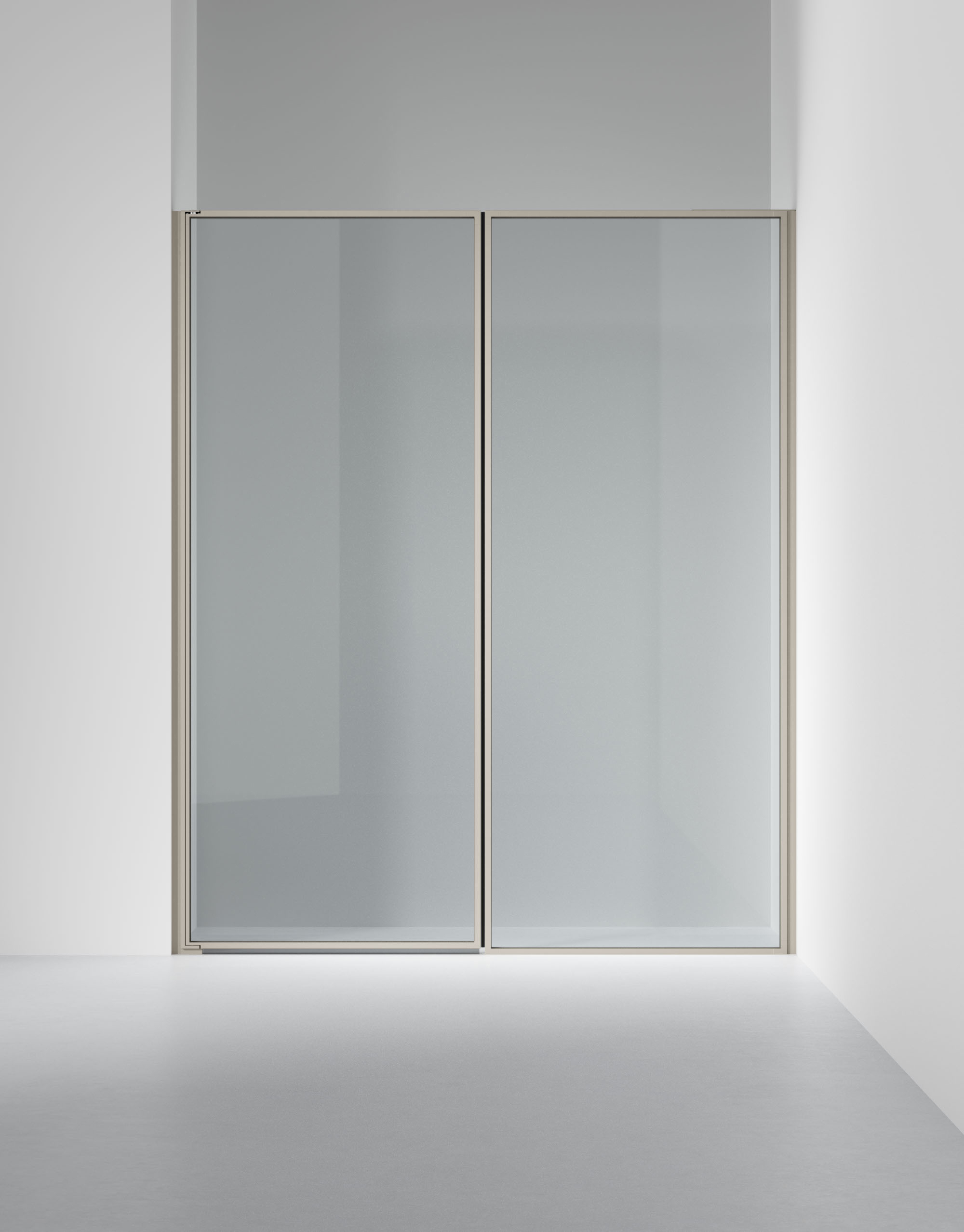 Duschlösning med en fast vägg och en dörr i 6 mm glas med integrerat grepp. Måttanpassas kostnadsfritt inom angivna intervall.
