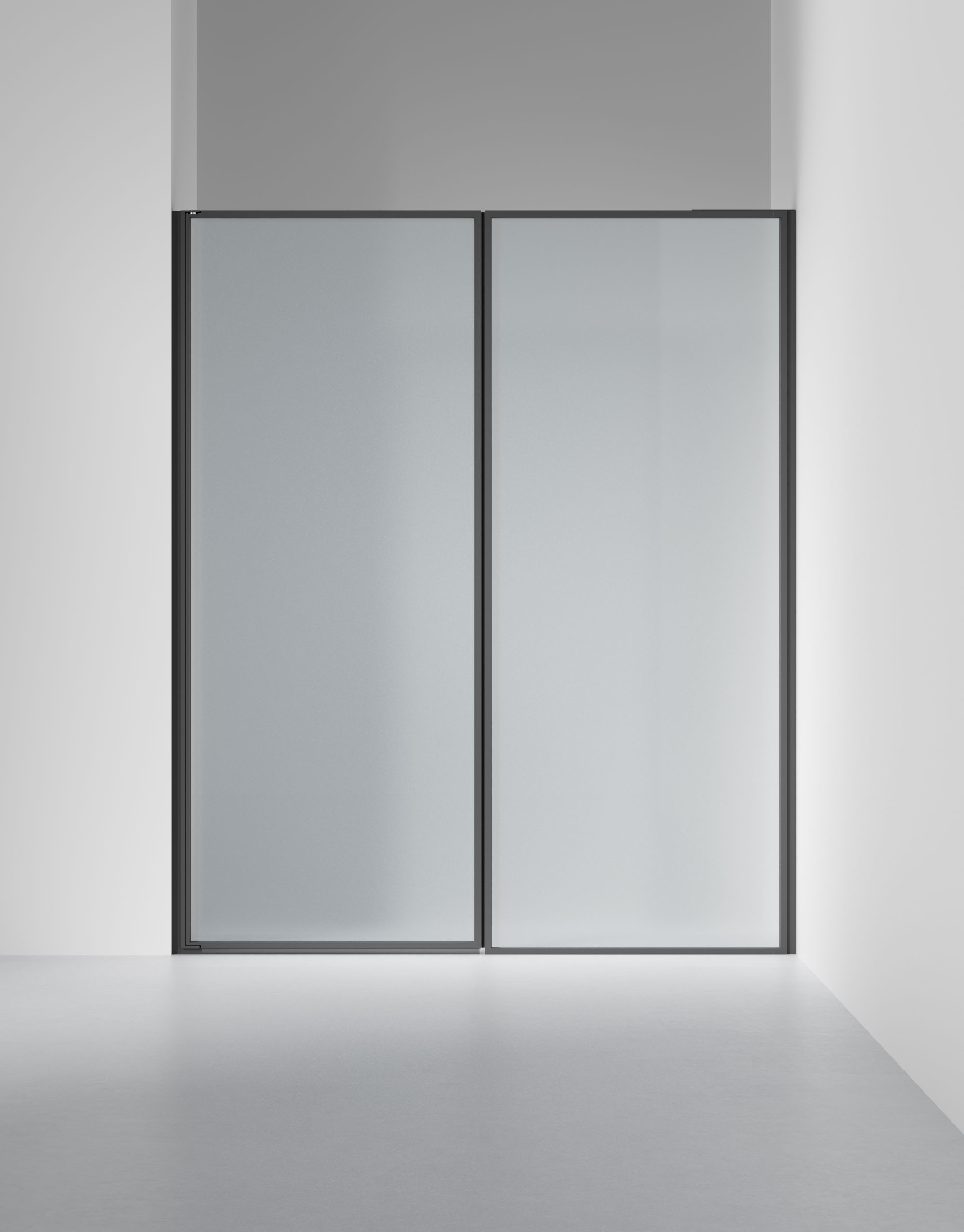 Duschlösning med en fast vägg och en dörr i 6 mm glas med integrerat grepp. Måttanpassas kostnadsfritt inom angivna intervall.