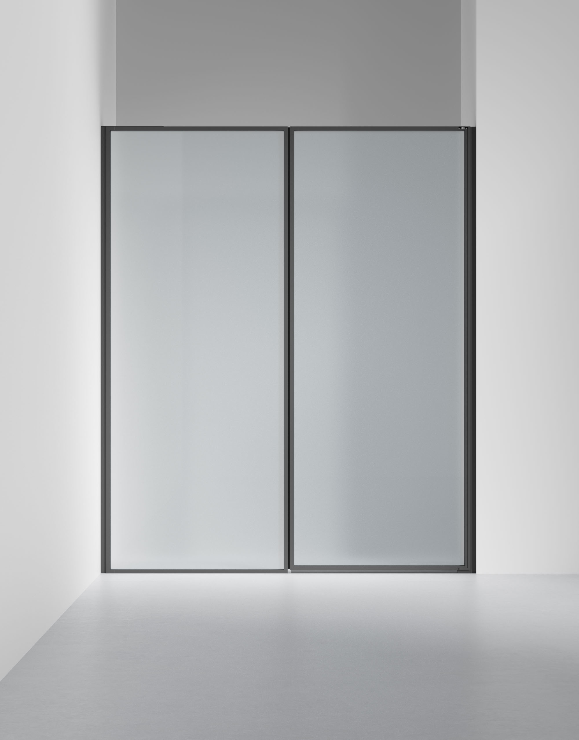 Duschlösning med en fast vägg och en dörr i 6 mm glas med integrerat grepp. Måttanpassas kostnadsfritt inom angivna intervall.