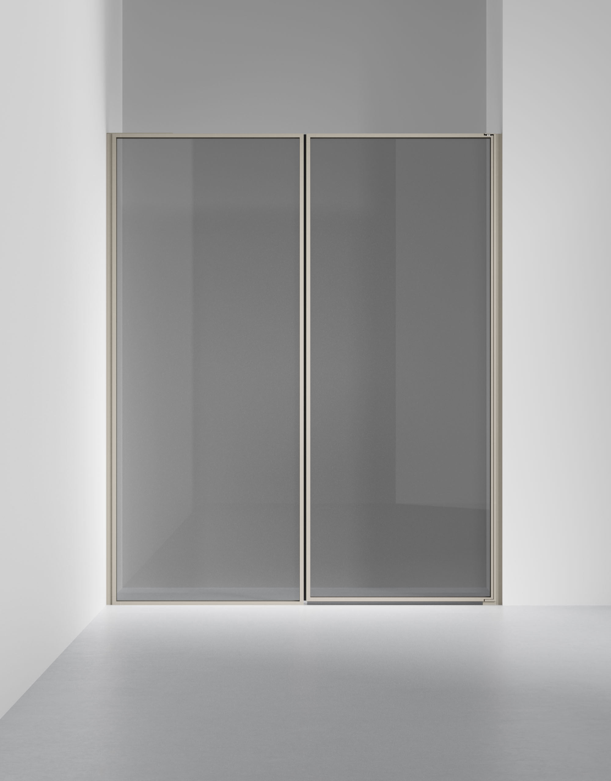 Duschlösning med en fast vägg och en dörr i 6 mm glas med integrerat grepp. Måttanpassas kostnadsfritt inom angivna intervall.