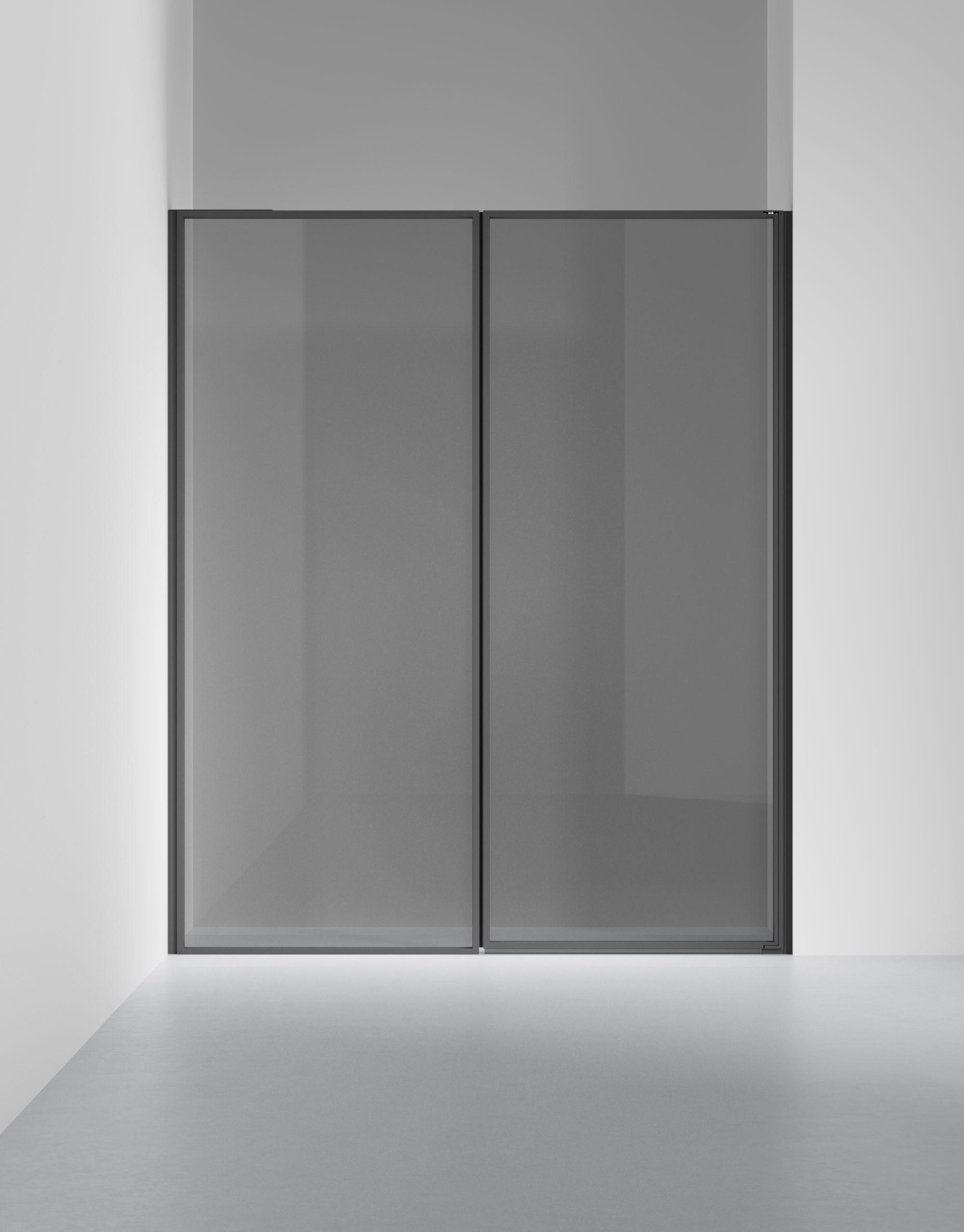 Duschlösning med en fast vägg och en dörr i 6 mm glas med integrerat grepp. Måttanpassas kostnadsfritt inom angivna intervall.