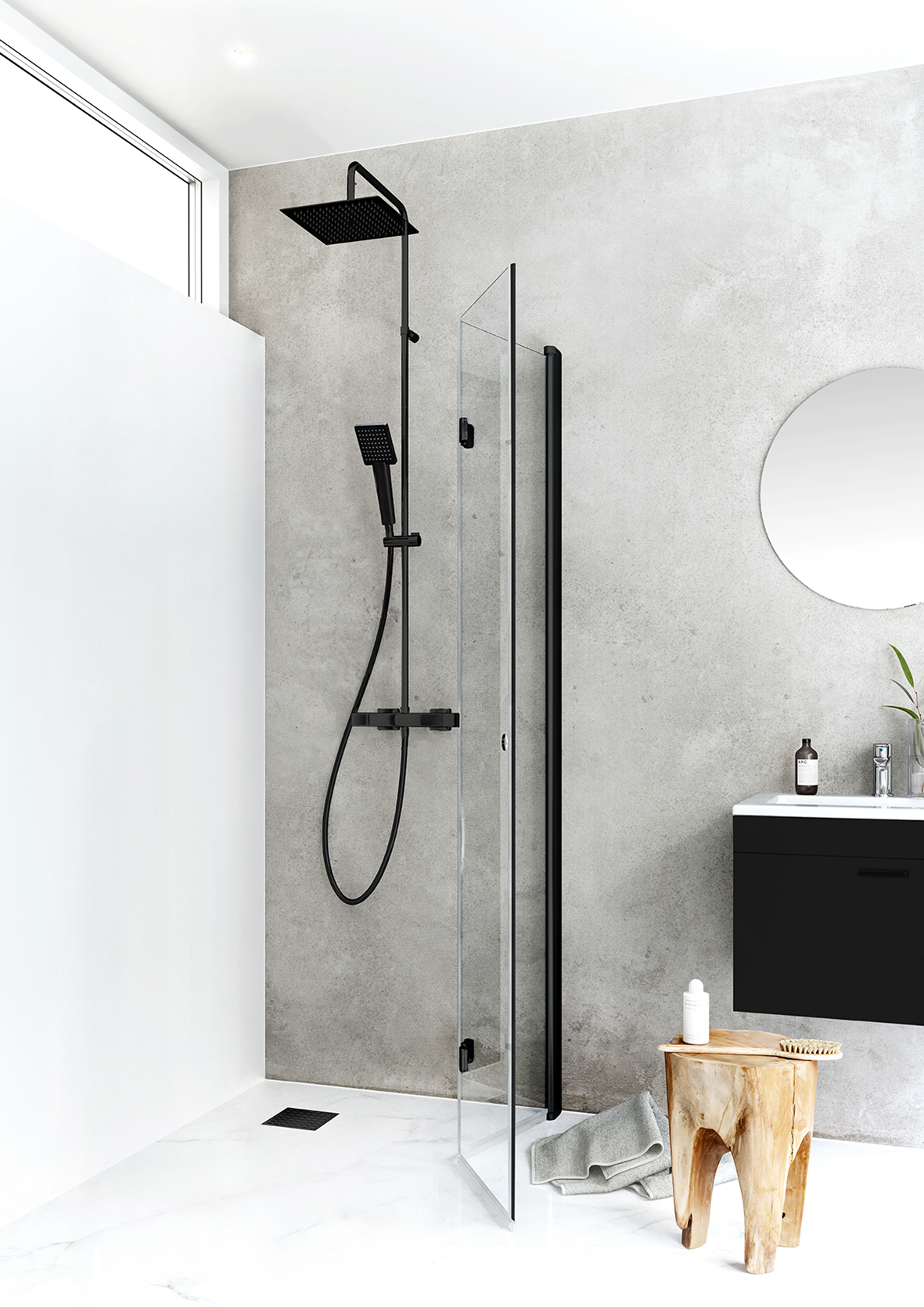 Vikbar duschdörr med klart glas som frigör yta och gör det möjligt att skapa en smart duschlösning för det lilla badrummet. Den vikbara dörren kan lätt fällas in mot väggen när den inte används och skapar en praktisk duschlösning även om WC eller badrumsmöbel är placerade nära duschen. Duschdörren är stabilt med en svart eller aluminiumfärgad väggprofil som kan monteras med skruv eller limbrickor. Den har en patenterad lösning för enkel installation och justering, Hafa's InstaQuick™. Duschdörren har lyftgångjärn för att den inte skall ta i golvet vid öppning och är vändbar så du kan välja vilken vägg den skall installeras på. Duschdörren kan kombineras med andra dörrar och väggar i IglooPro-serien. 6 mm härdat säkerhetsglas. Höjd 2000 mm. Kan monteras med utanpåliggande rör, 35 mm. 18 mm släplist ingår. Integrerat handtag.