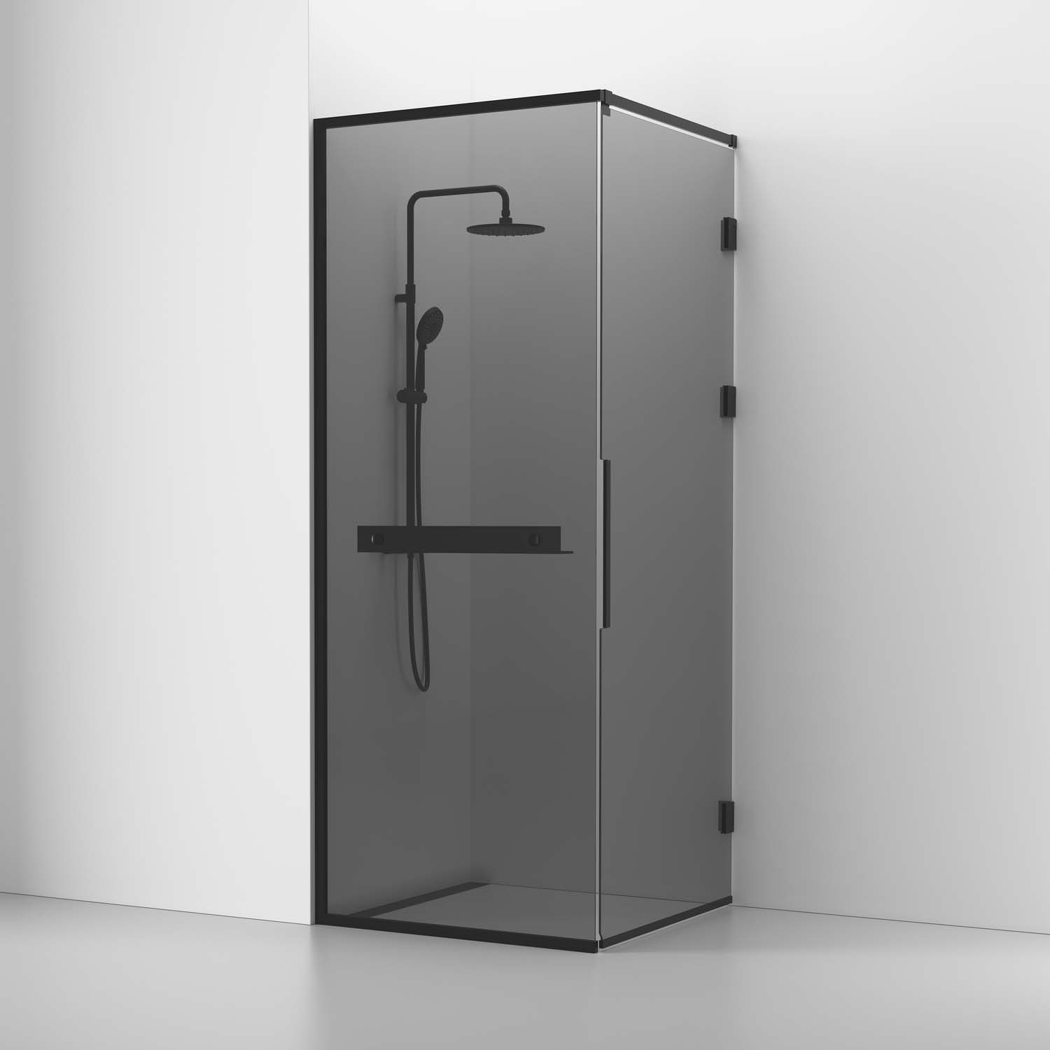Langfoss rak/fast hörndusch 80x92x230 svart matt profil och rökglas. Hylla.