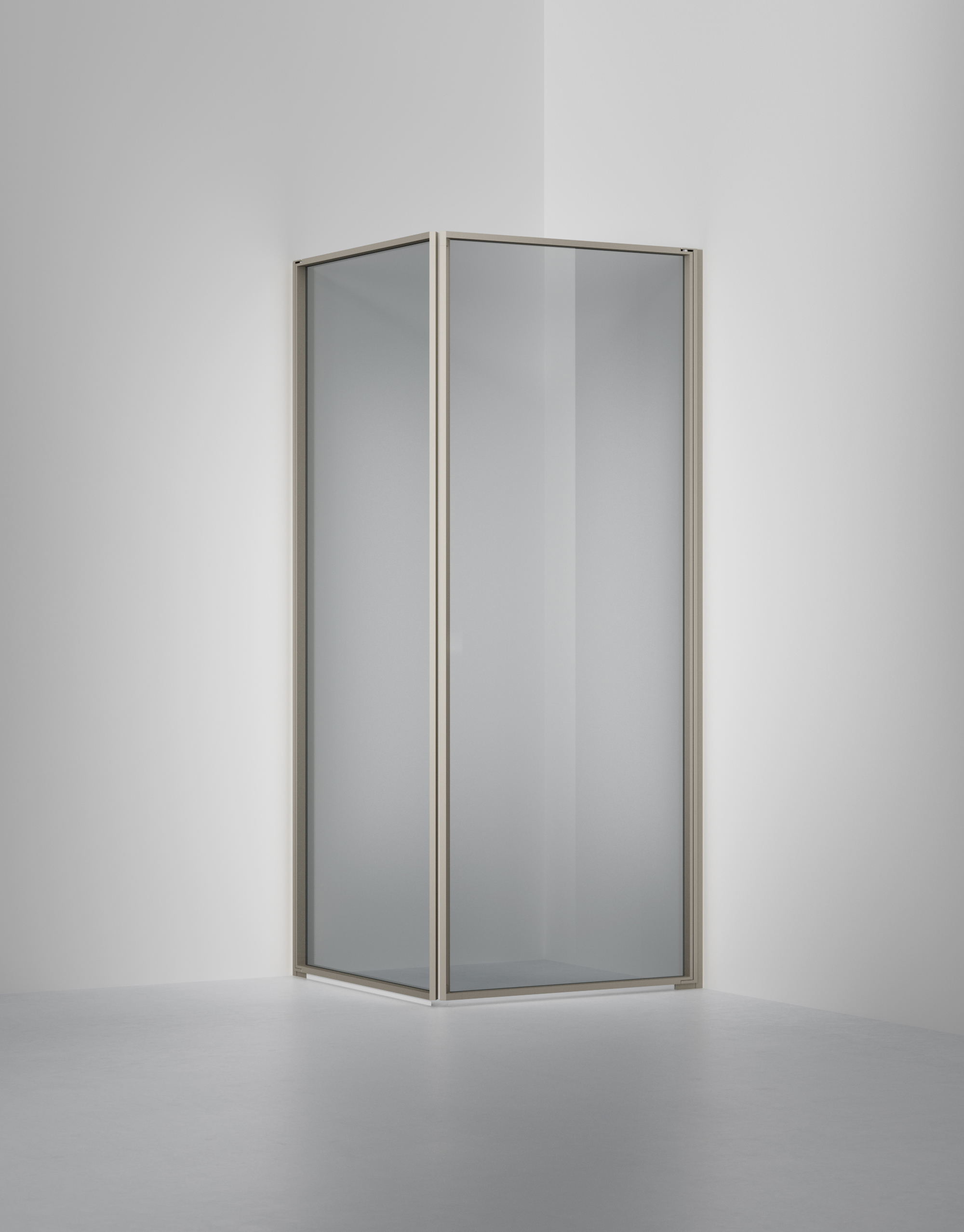 Duschhörna med två dörrar i 6 mm glas och med integrerat grepp. Finns i 900x900 mm och i måttanpassat utförande.