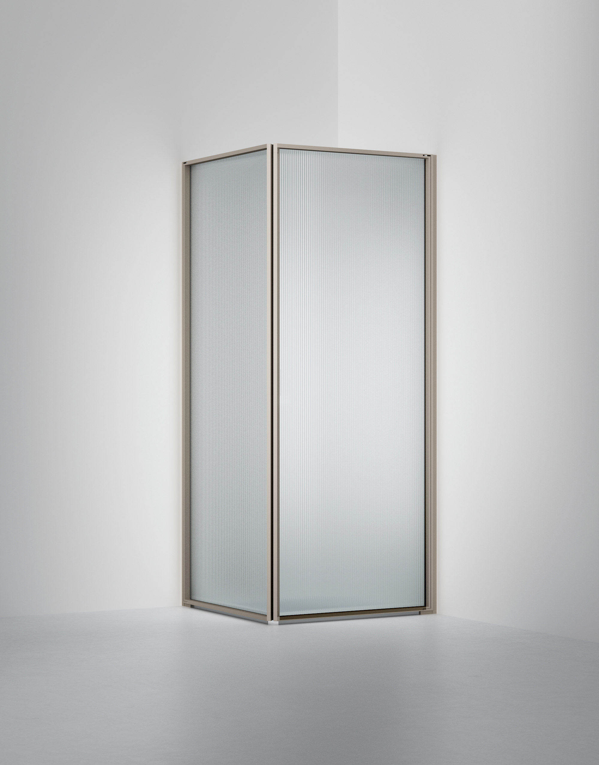 Duschhörna med två dörrar i 6 mm glas och med integrerat grepp. Finns i 900x900 mm och i måttanpassat utförande.