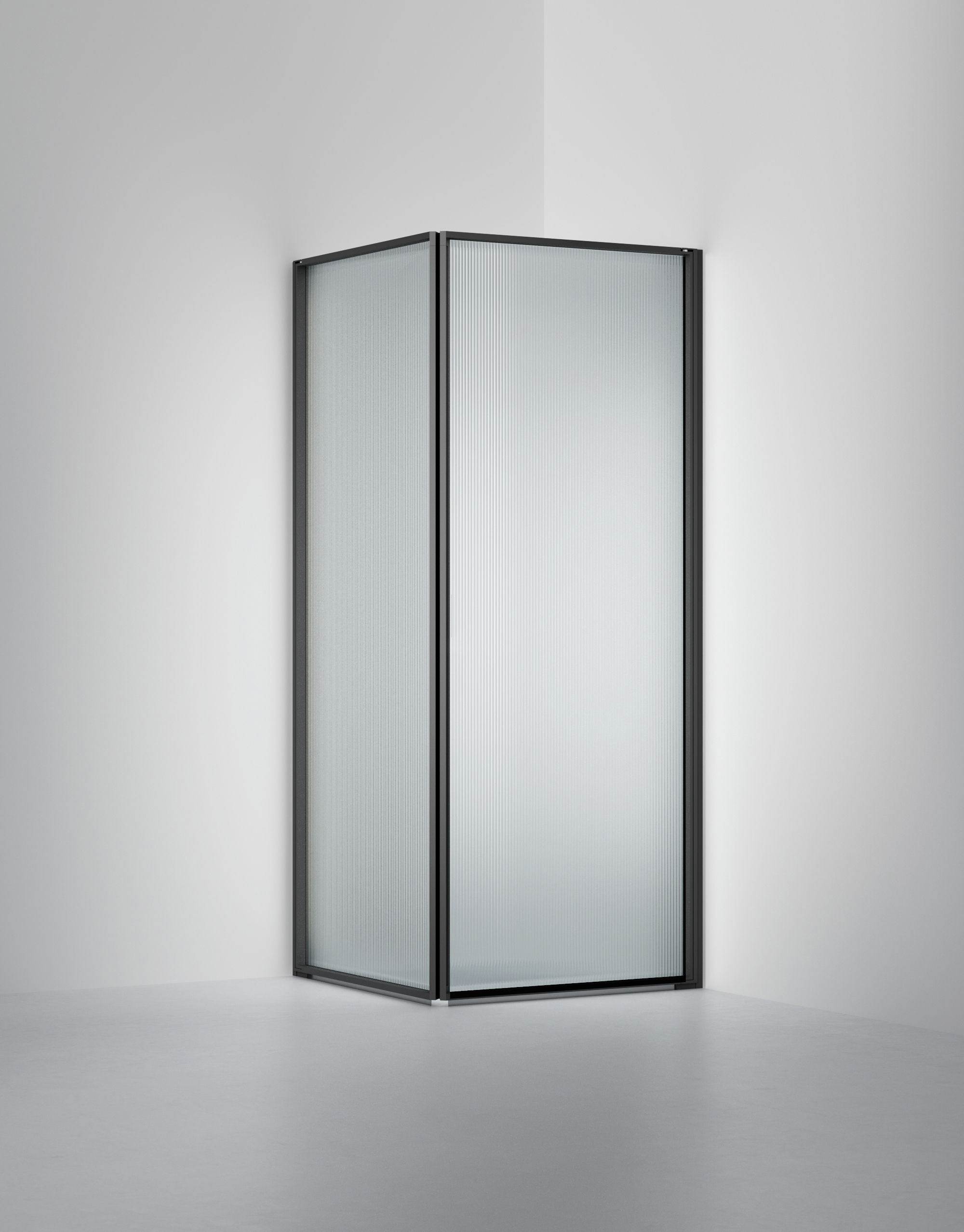 Duschhörna med två dörrar i 6 mm glas och med integrerat grepp. Finns i 900x900 mm och i måttanpassat utförande.