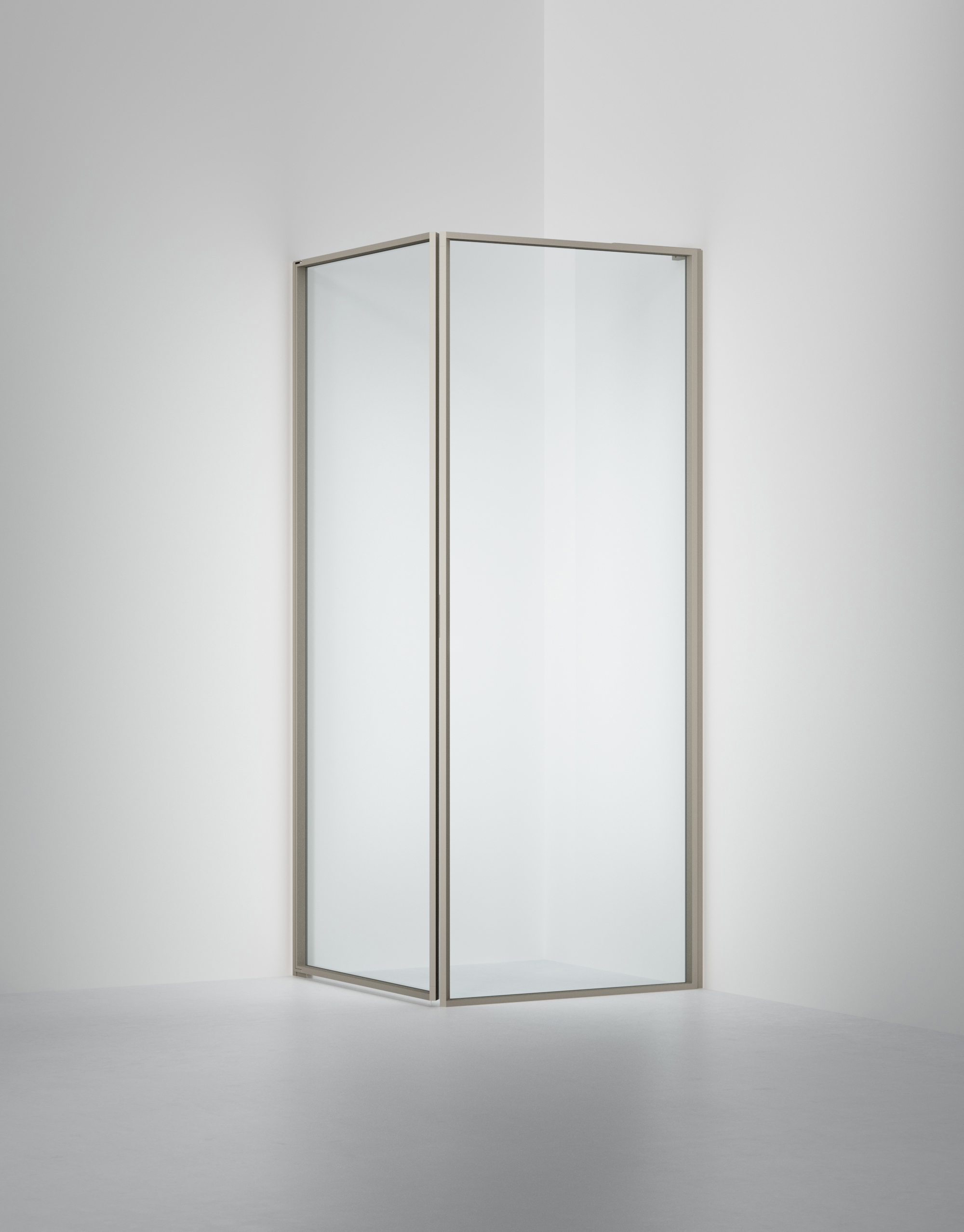 Duschhörna i 6 mm glas men en vägg och dörr med integrerat grepp. Måttanpassas kostnadsfritt inom angivna intervall.