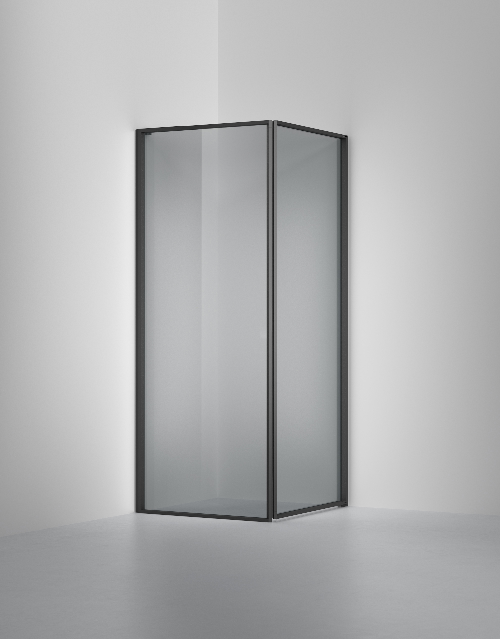 Duschhörna i 6 mm glas men en vägg och dörr med integrerat grepp. Måttanpassas kostnadsfritt inom angivna intervall.