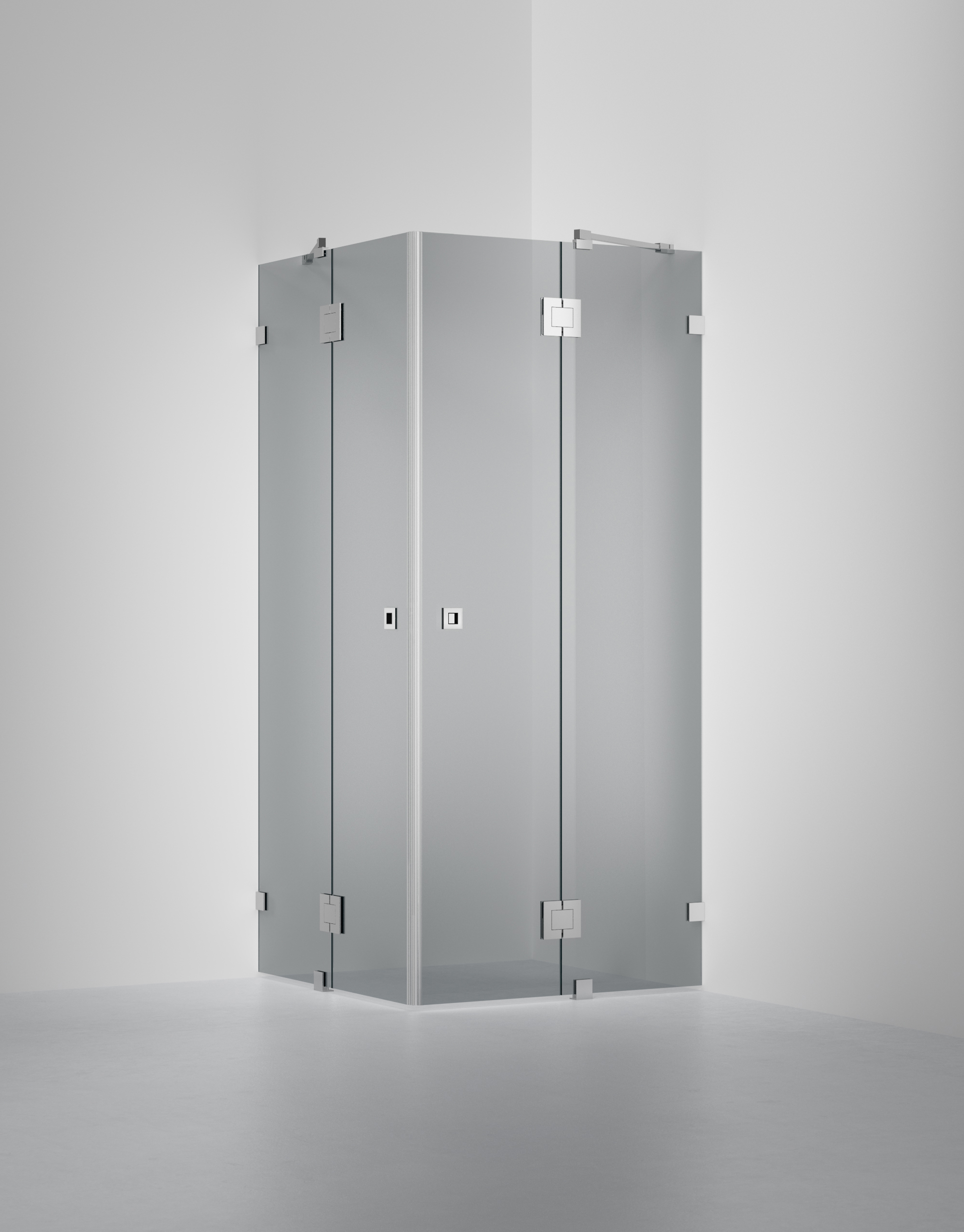 ARC 16 är en duschhörna i 8 mm säkerhetsglas och egendesignade beslag i krom med två fasta väggar. Lösningen har inga bottenlister men levereras med transparenta magnetlister där dörrarna möts, för att skydda glaskanterna och för att sluta tätt. Den smarta skenan håller duschstänk på rätt sida av duschutrymmet.
