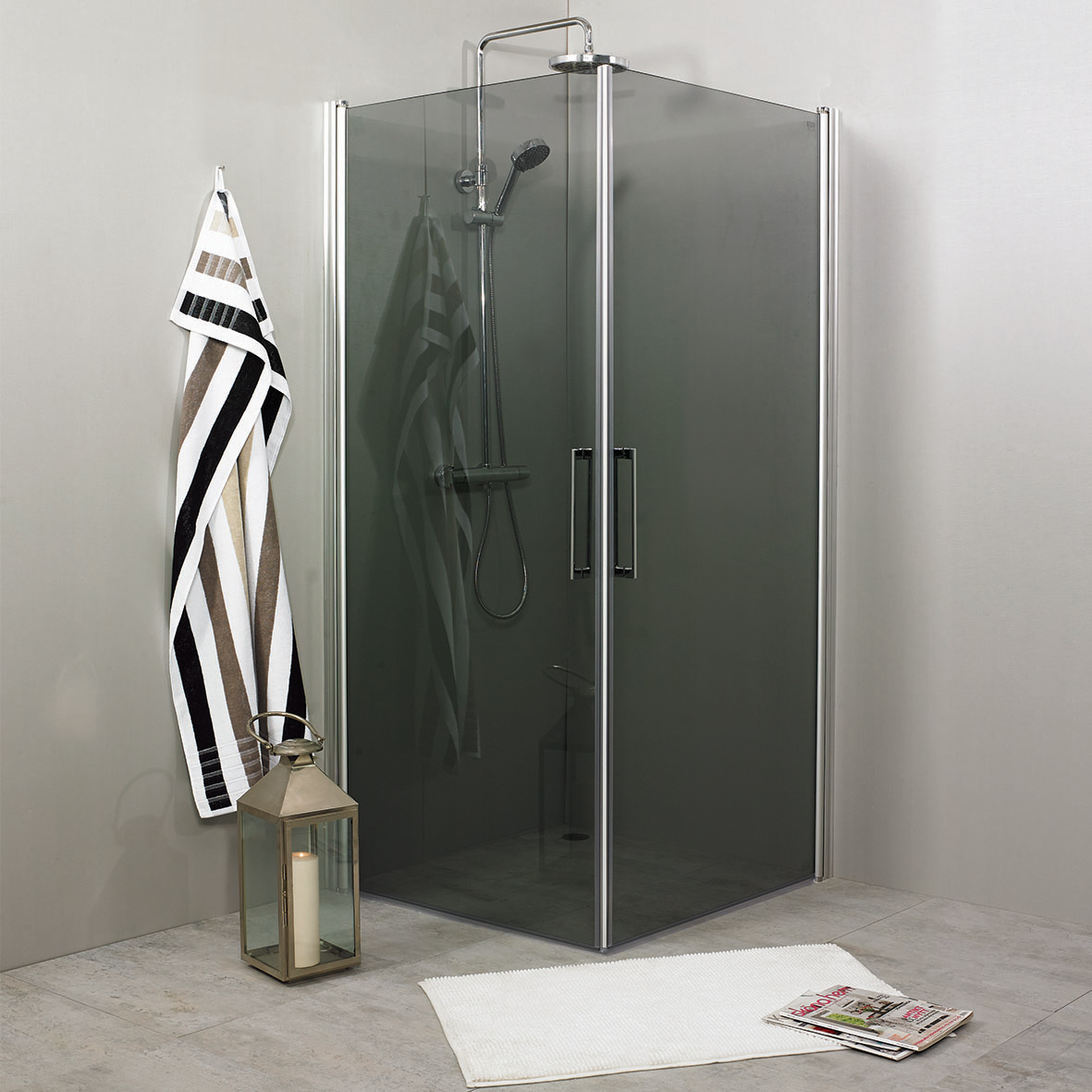 Avskalad och estetisk dusch för finsmakaren. Duschen finns i klarglas med 5 mm säkerhetsglas och 180° svängbara dörrar. Klarar utvändig rördragning upp till 35mm från vägg.