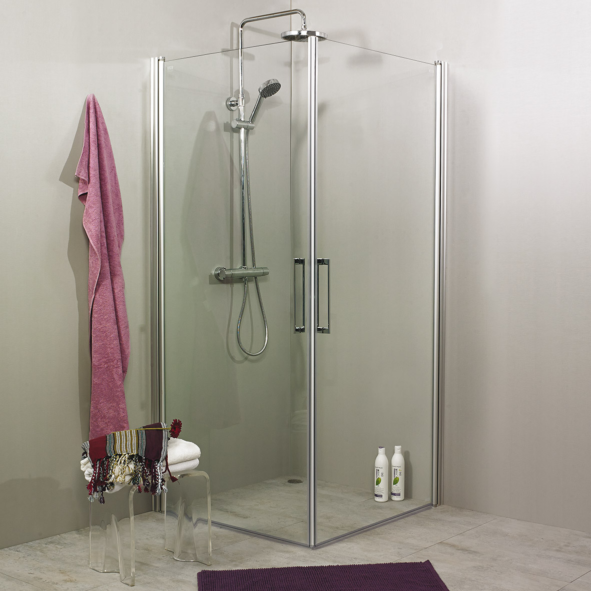 Avskalad och estetisk dusch för finsmakaren. Duschen finns i klarglas med 5 mm säkerhetsglas och 180° svängbara dörrar. Klarar utvändig rördragning upp till 35 mm från vägg.