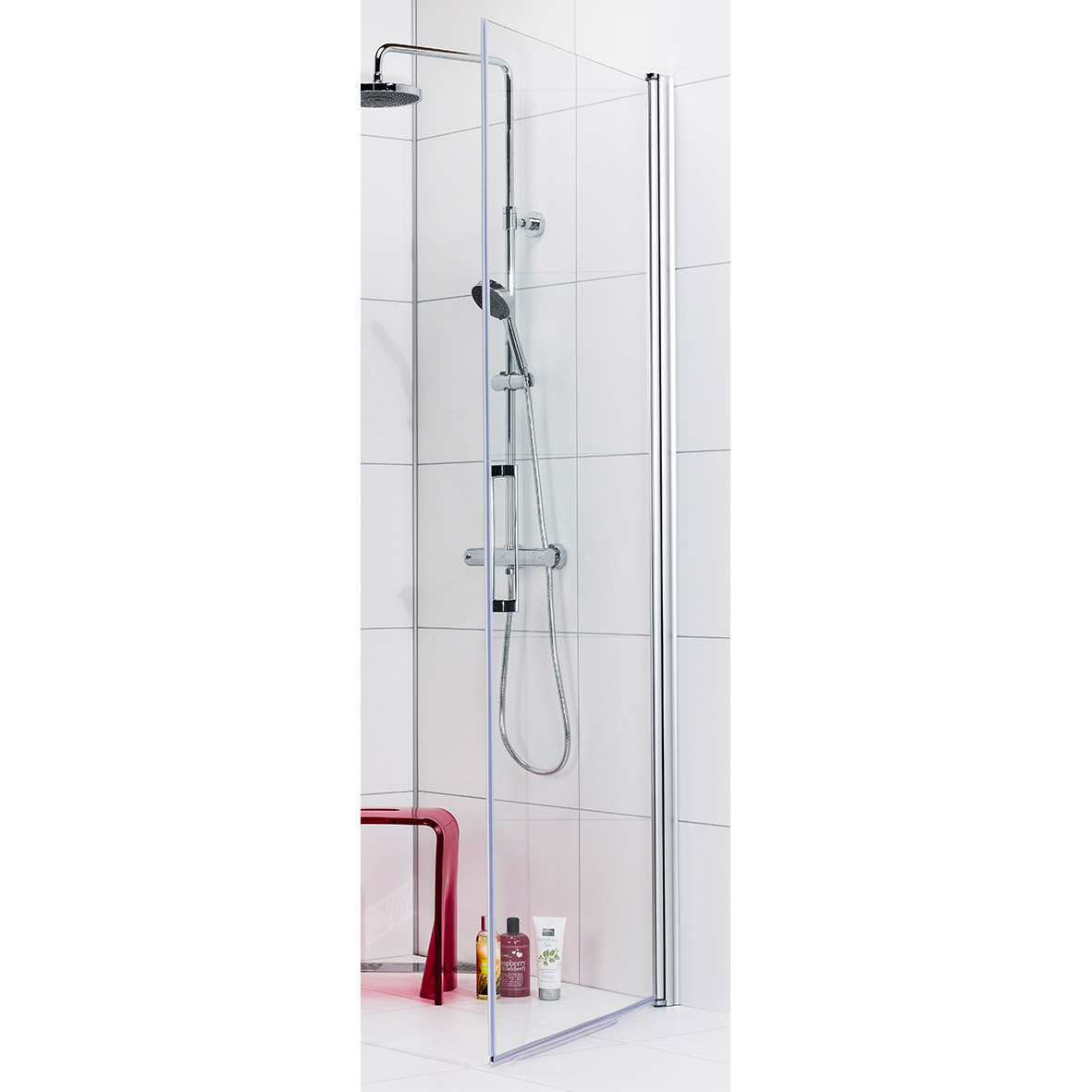 En flexibel och modern duschlösning bestående av en fast vägg tillsammans med en dörr, för montering i hörn. Duschlösningen ger dig stora variationsmöjligheter i dimensionerna. Du väljer själv vilken lösning som passar dig bäst, montering mot vägg eller tak. Duschen finns i klarglas, frostat glas samt Happy Going mönster. Vid rördragning för fast duschvägg måste duschväggen kompletteras med rördragningsprofil.
