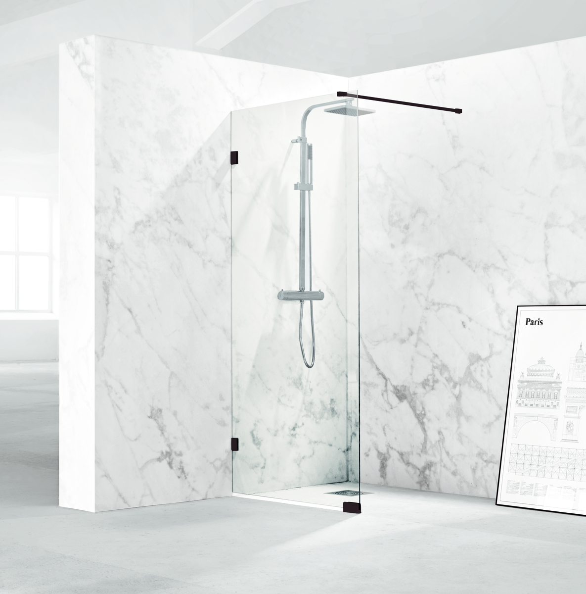 180° fast skärmvägg 78 svart matt profil och klarglas..