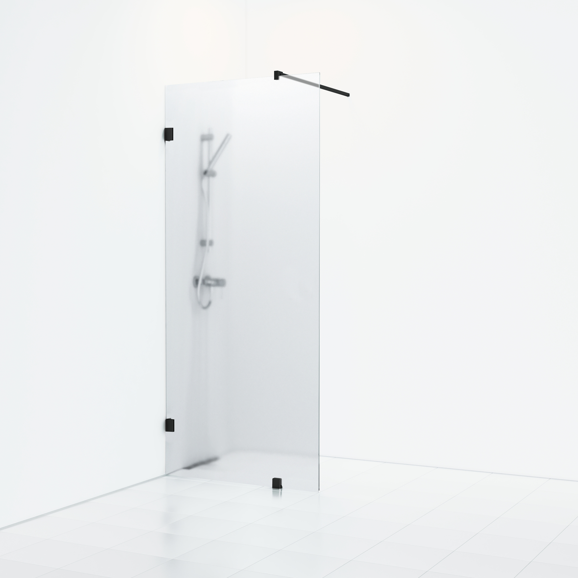 180° fast skärmvägg 98 svart matt profil och kristall frostglas..
