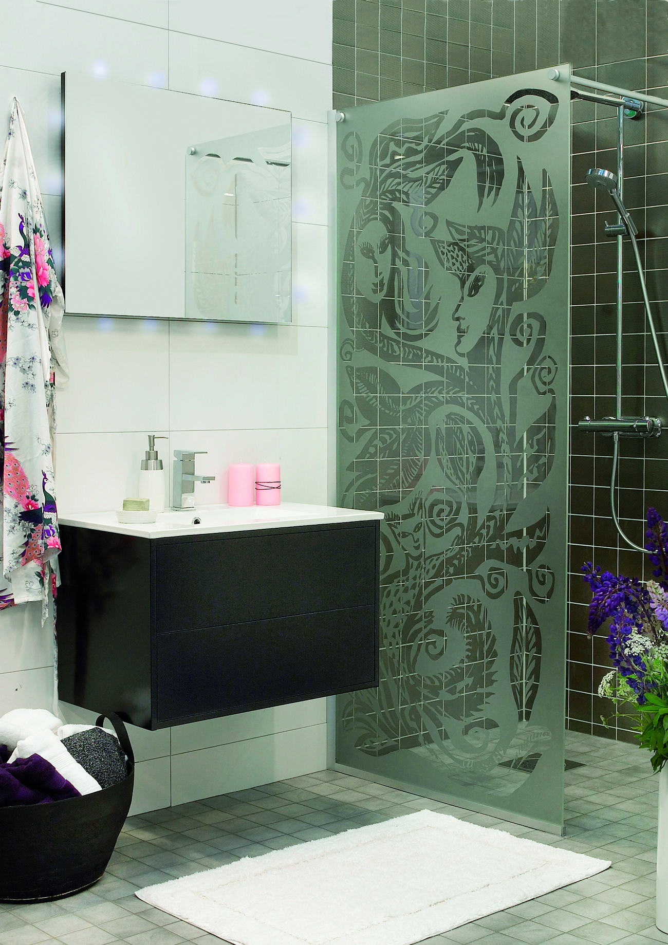 NORO FROST DV Happy Going är en elegant duschvägg med Hydman Vallien mönster. I serien finns modeller för placering i hörn samt mer centralt i rummet.