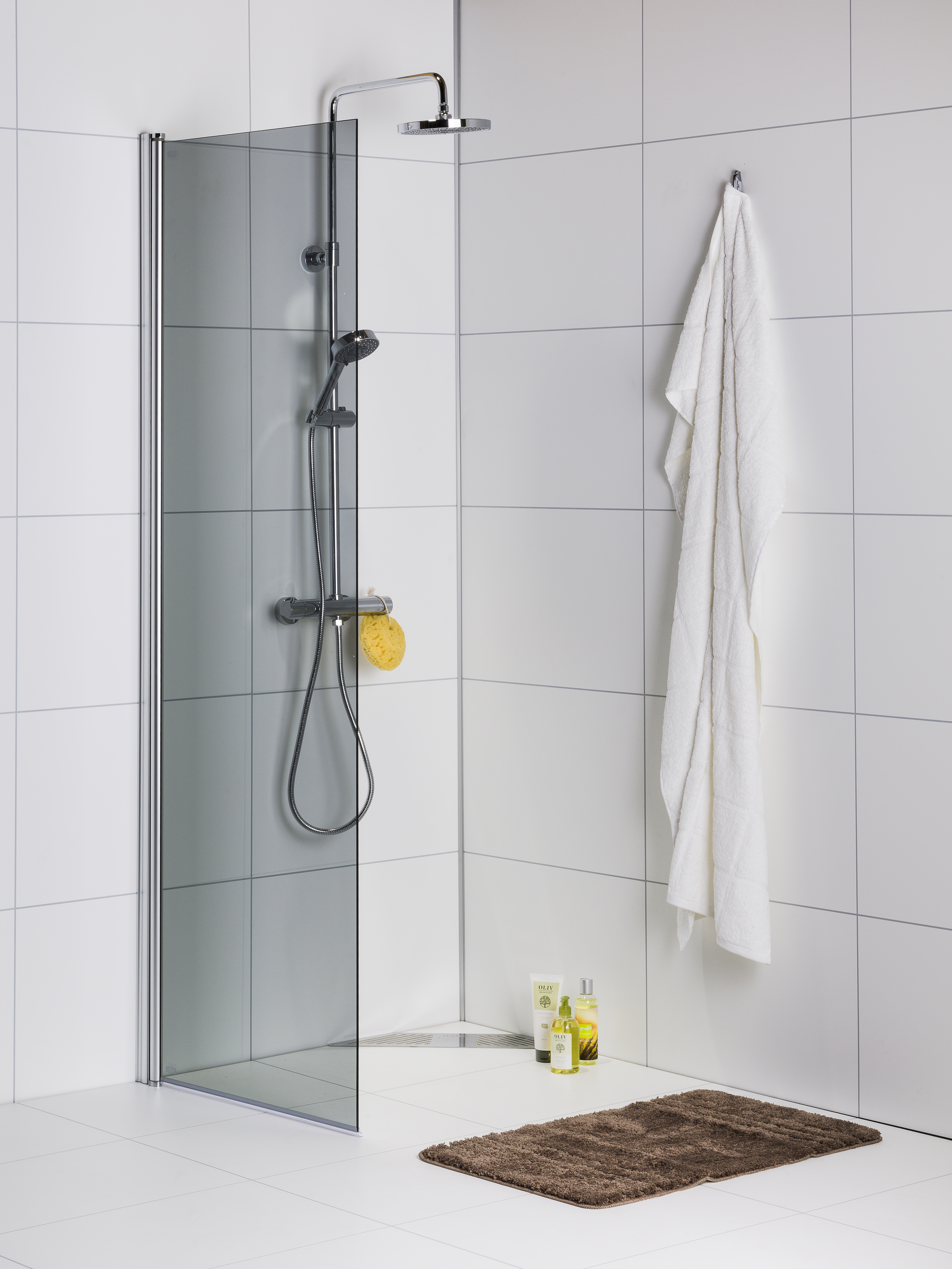 Rak duschvägg med 6 mm härdat säkerhetsglas, lyftgångjärn som lyfter 5 mm. Dörren är svängbar 180 grader. Polerad kraftig aluminiumprofil i silvermatt finish. Klarar utvändig rördragning upp till 35 mm från vägg.