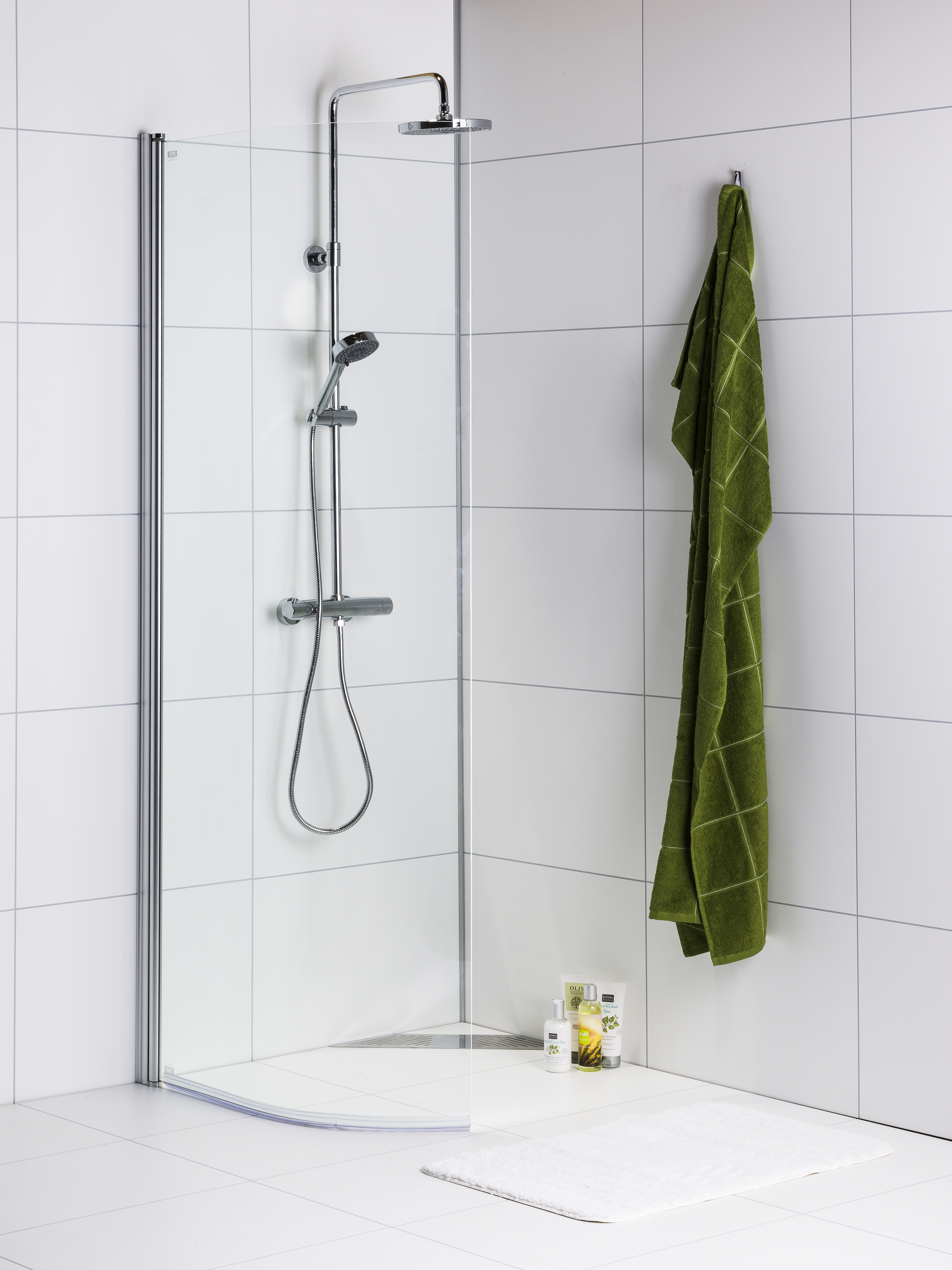 Duschvägg i bockat 6 mm härdat säkerhetsglas, lyftgångjärn som lyfter 5 mm. Polerad kraftig aluminiumprofil, silvermatt finish. Klarar utvändig rördragning upp till 35 mm från vägg.