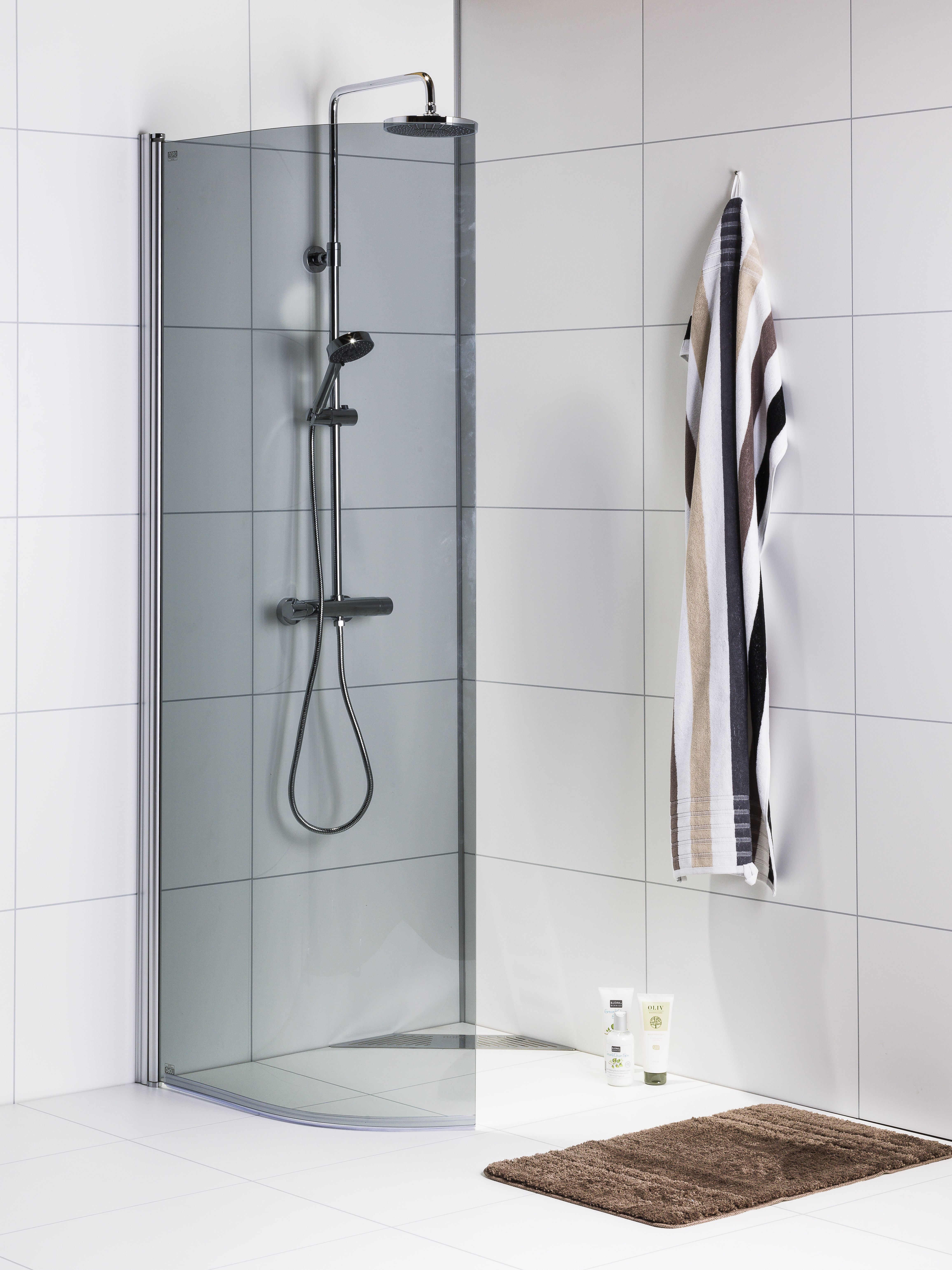 Duschvägg i bockat 6 mm härdat säkerhetsglas, lyftgångjärn som lyfter 5 mm. Polerad kraftig aluminiumprofil, silvermatt finish. Klarar utvändig rördragning upp till 35 mm från vägg.