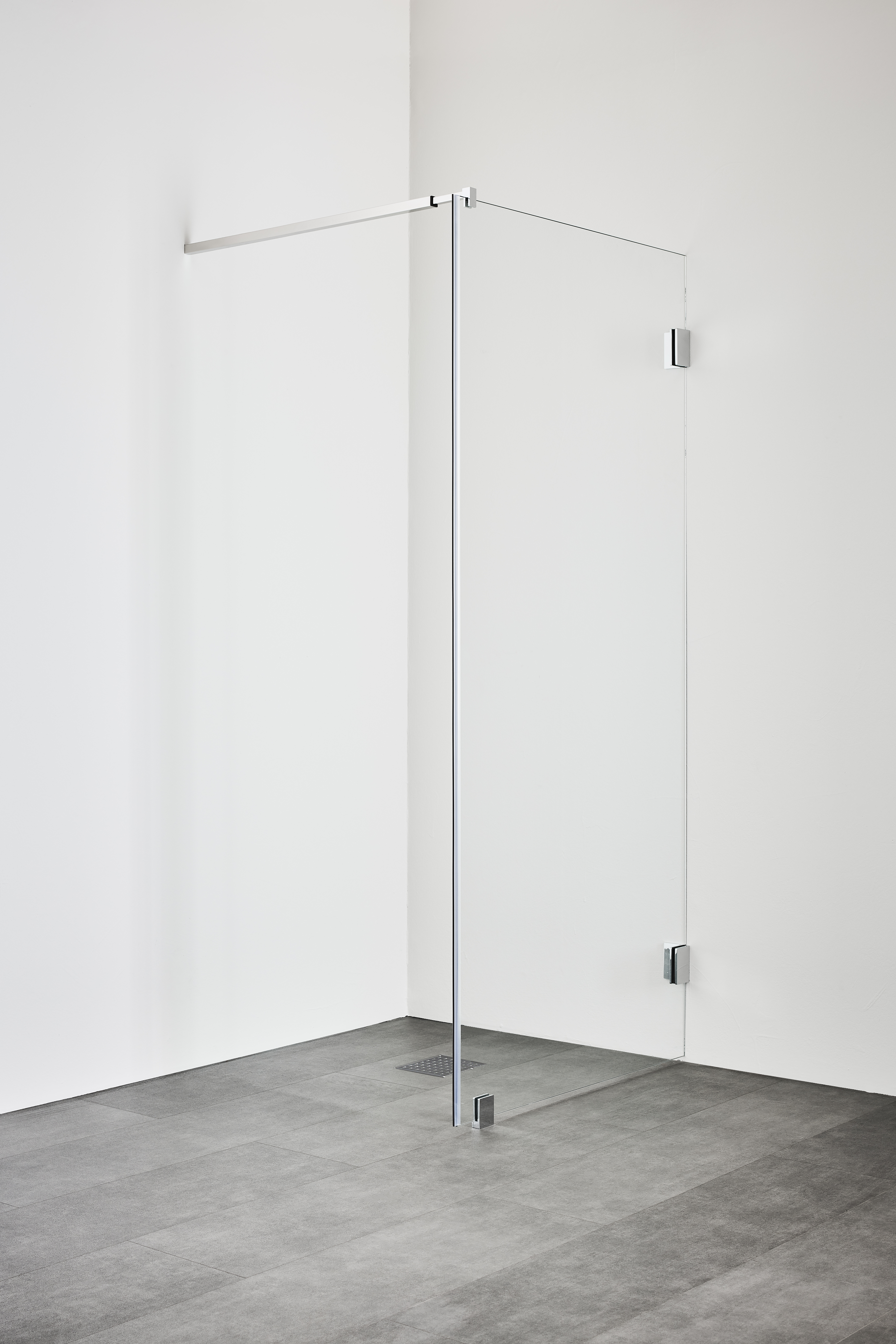 En exklusiv duschvägg med smäckra beslag och en elegant draperistång. Välj mellan tre färger, krom, matt svart eller borstad mässingsfärg. De stora glasytorna ger ett luftigt intryck och skapar en härlig rymd i badrummet.