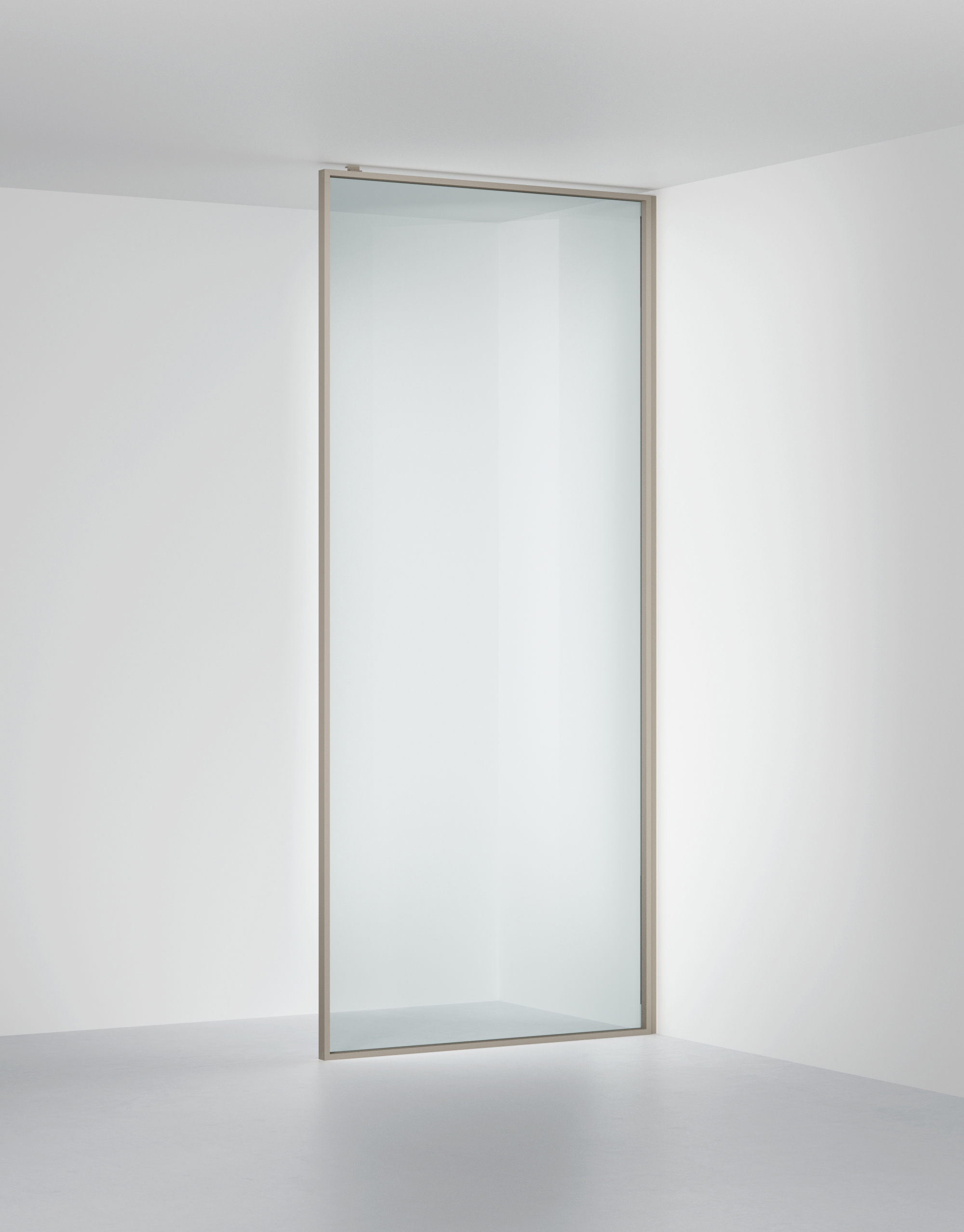 En fast vägg i 6 mm glas. Måttanpassas kostnadsfritt inom angivna intervall och från golv till tak upp till 2700 mm.
