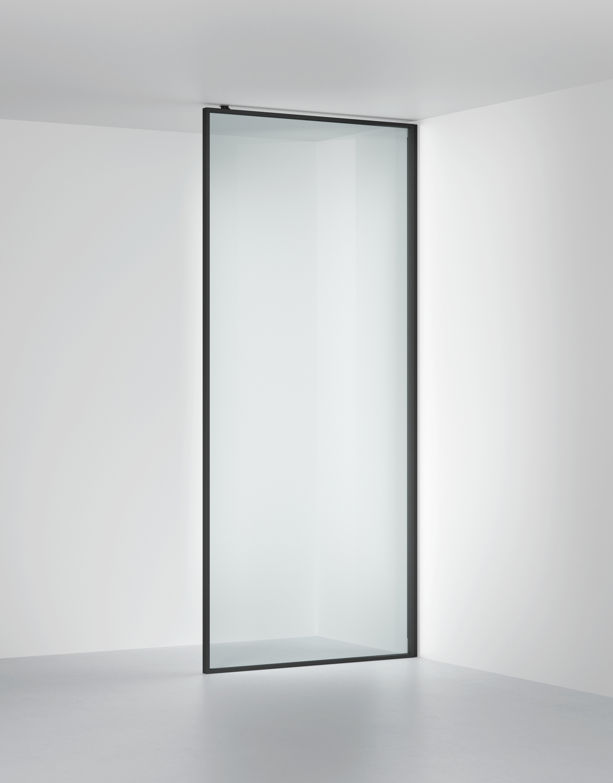 En fast vägg i 6 mm glas. Måttanpassas kostnadsfritt inom angivna intervall och från golv till tak upp till 2700 mm.