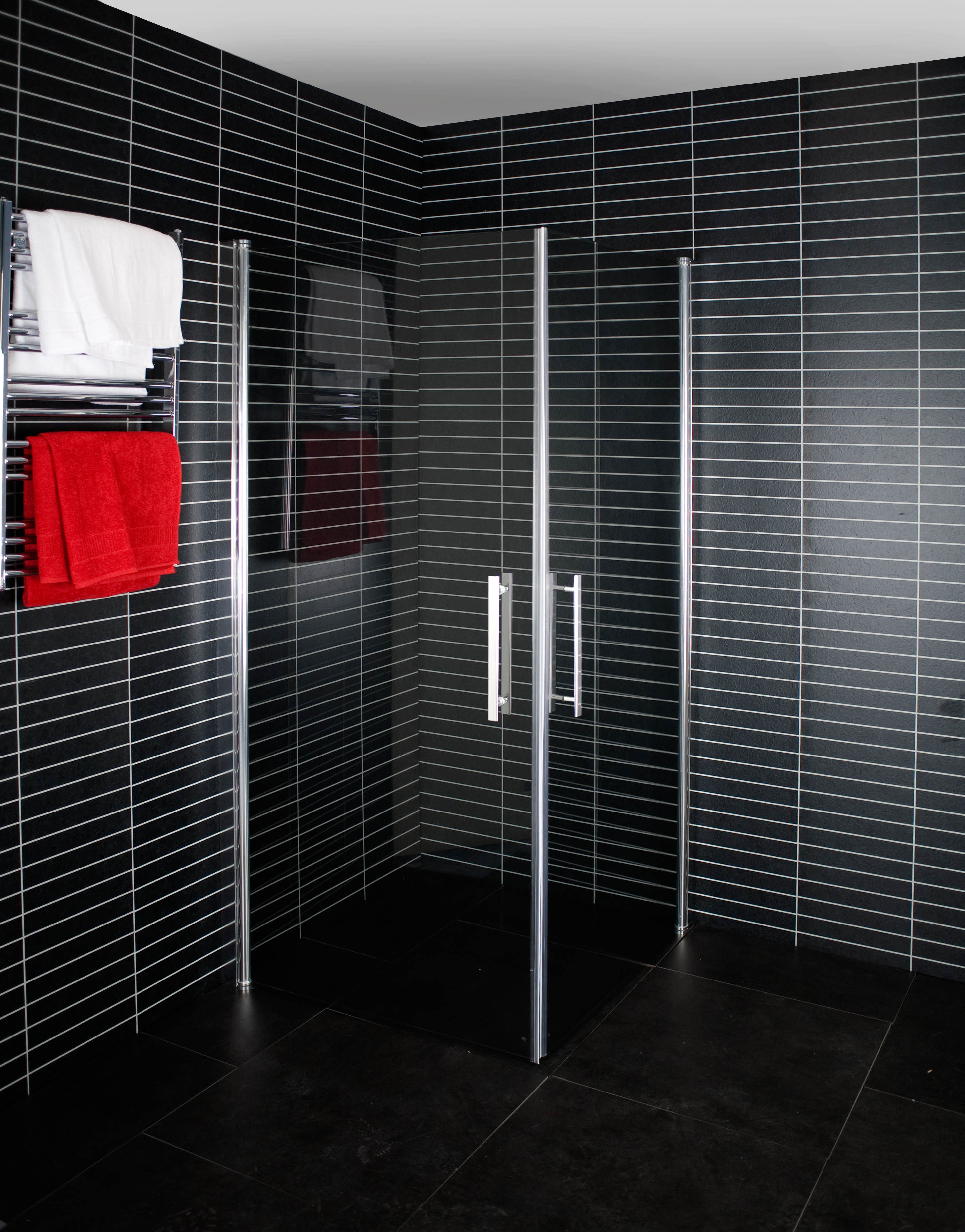 Rak glasdörr som kan vikas inåt. Vändbar! Kan monteras som både höger och vänster duschvägg. 100 cm bred. Lyftgångjärn med höjning 5 mm. Tröskelfri. Blanka profiler. Härdat tonat glas 6 mm. Släplist medföljer .